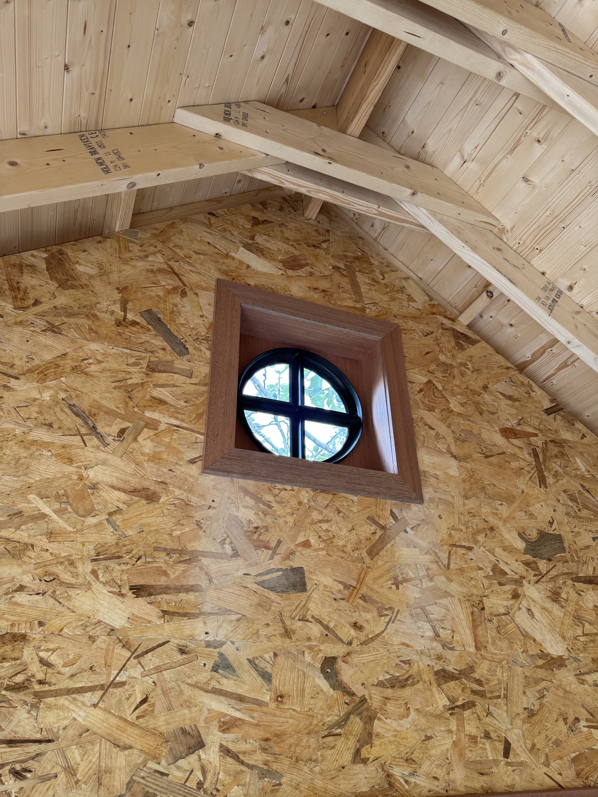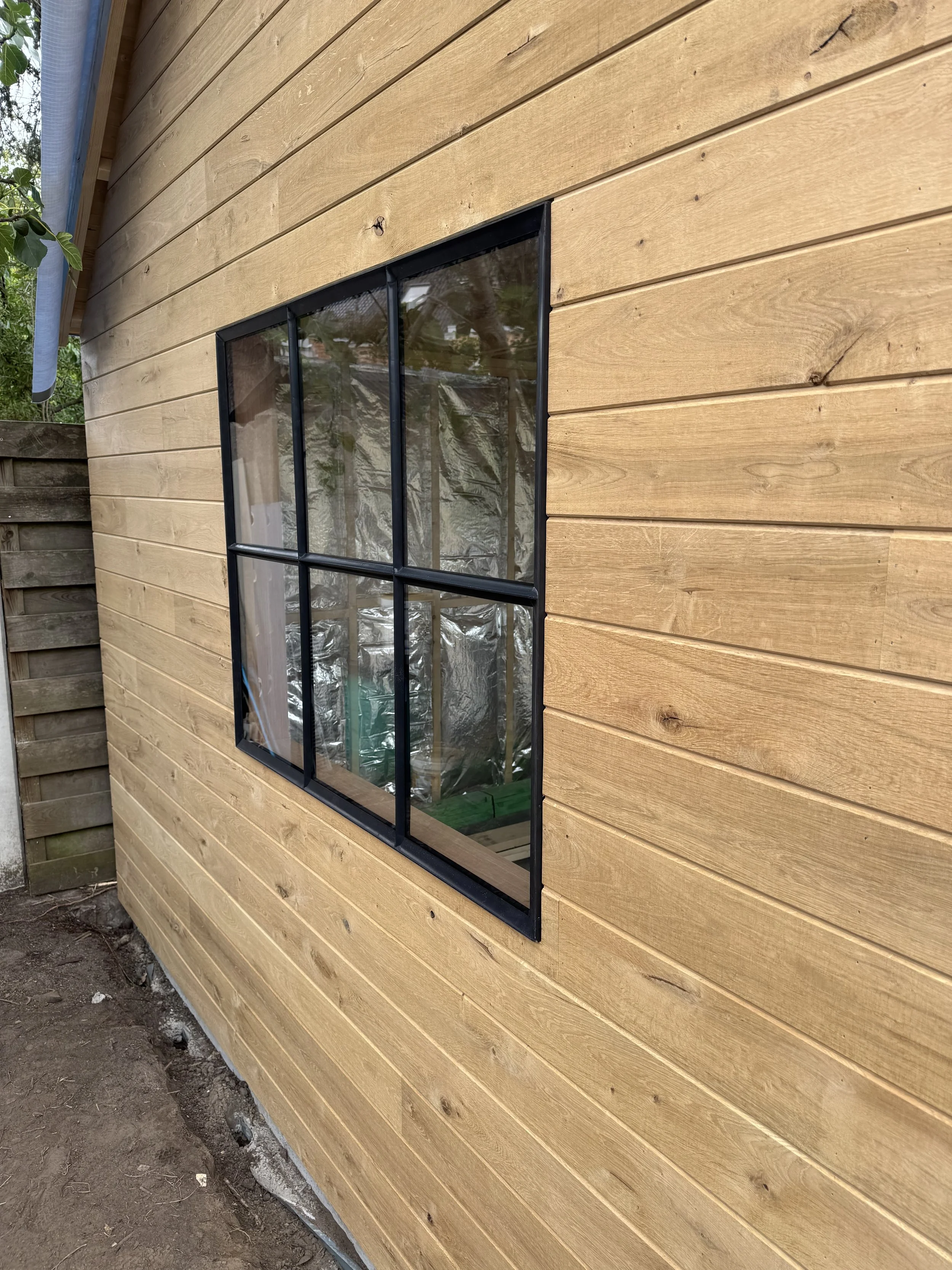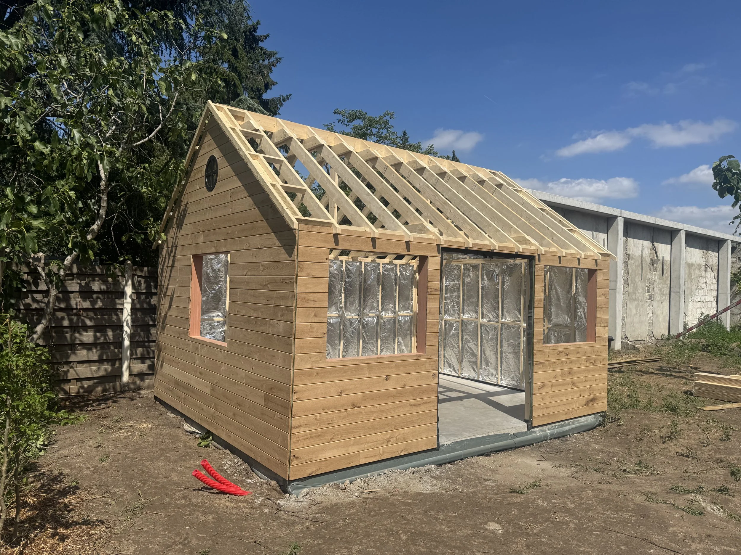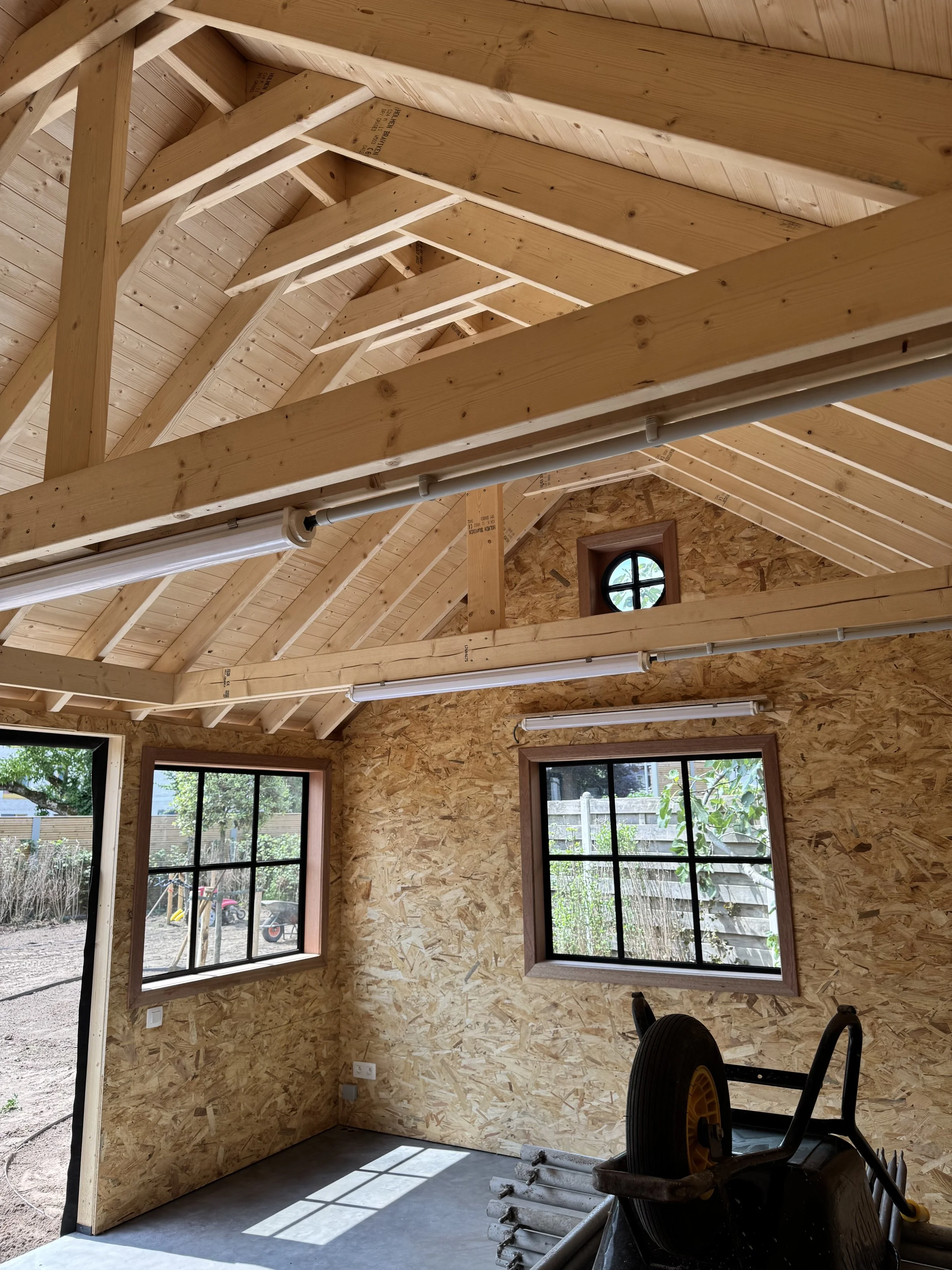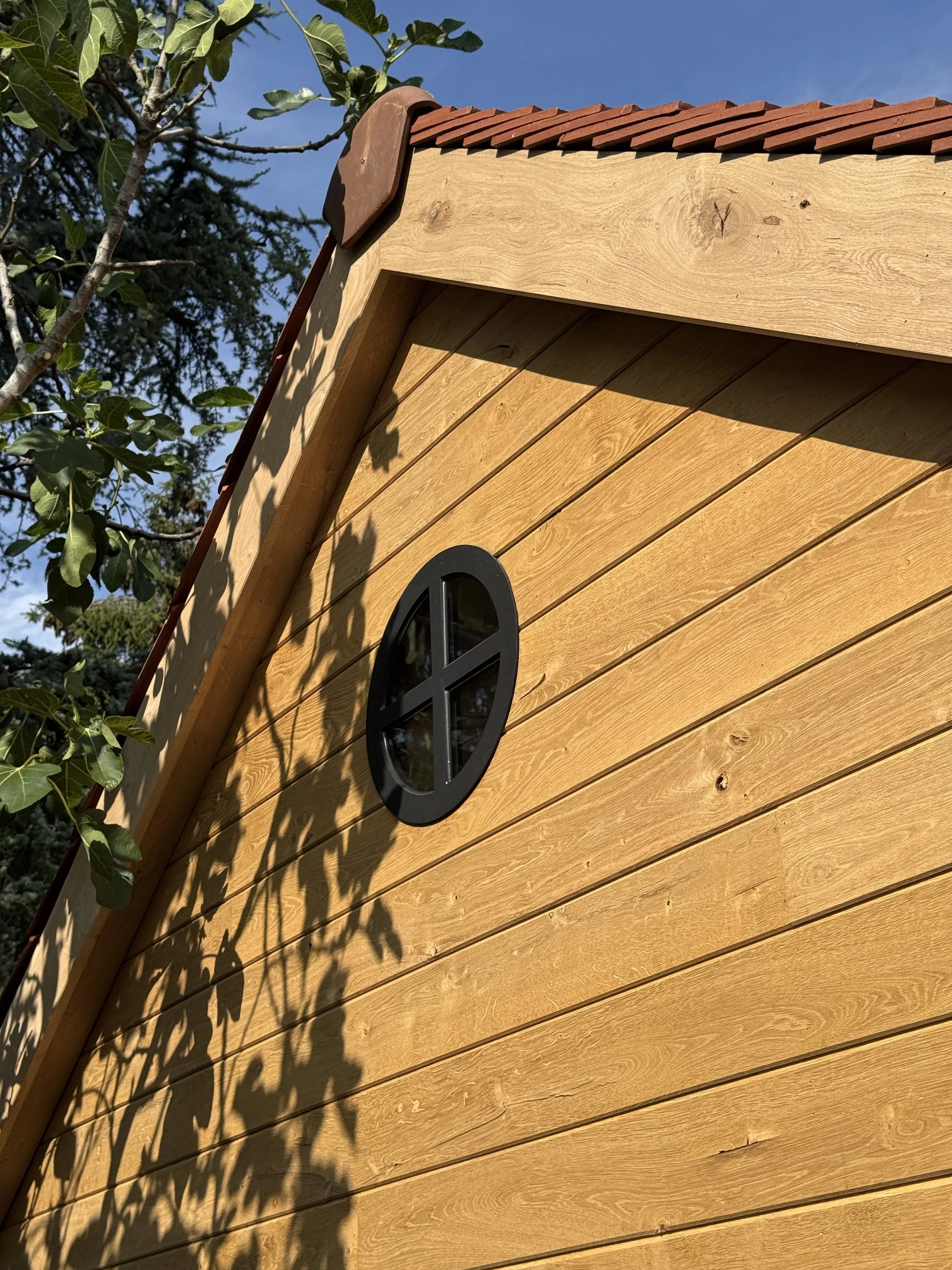 Het gebouw is uitgerust met twee grote ramen die overvloedig natuurlijk licht binnenlaten, en als charmant detail siert een rond raampje in de nok de zijgevel. Binnenin is het bijgebouw volledig voorzien van OSB-platen en volledig geïsoleerd, wat zorgt voor comfort en een aangename binnensfeer doorheen alle seizoenen.