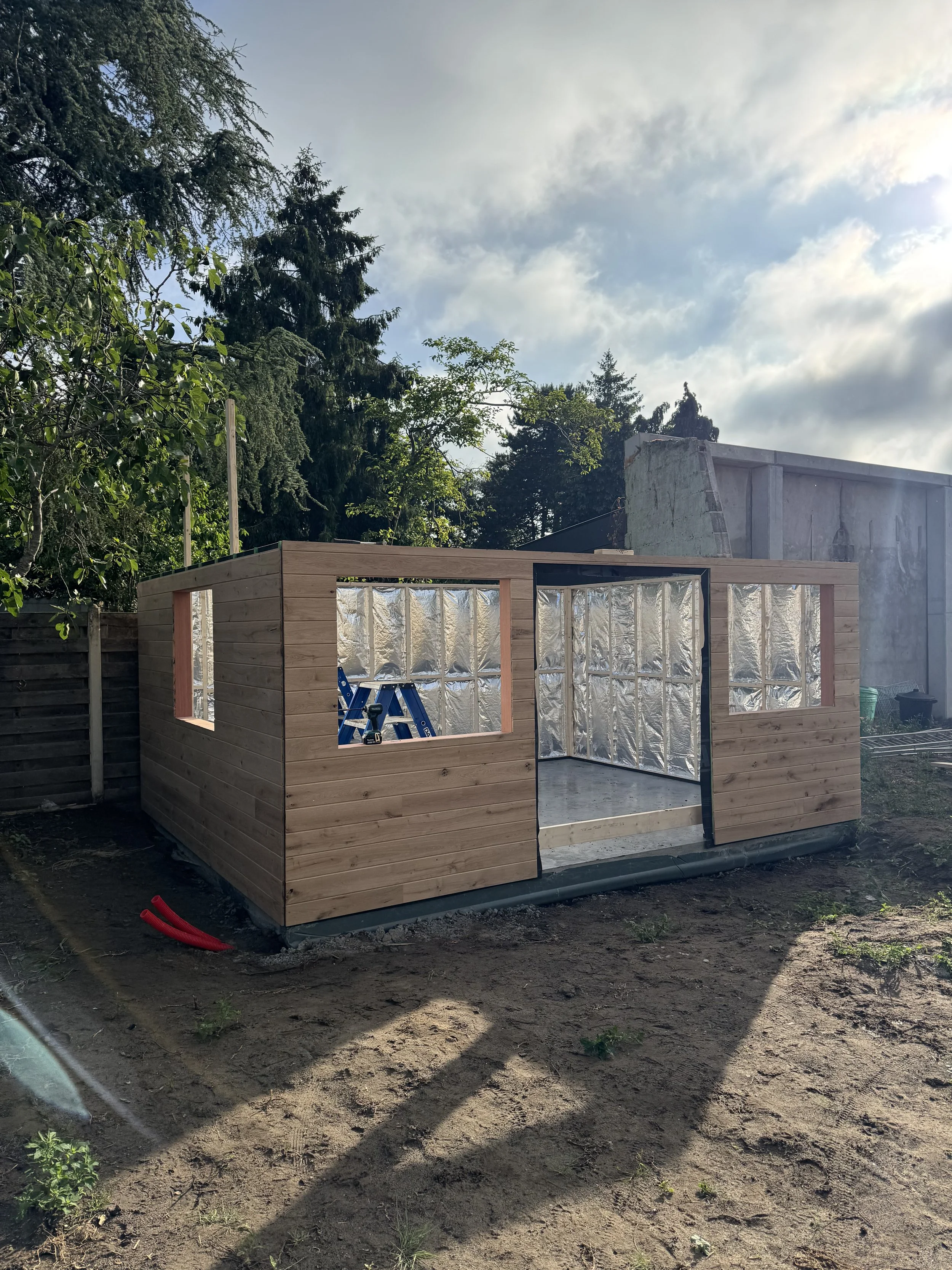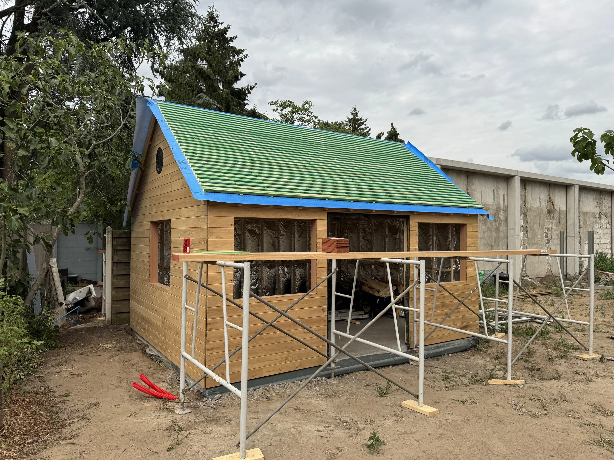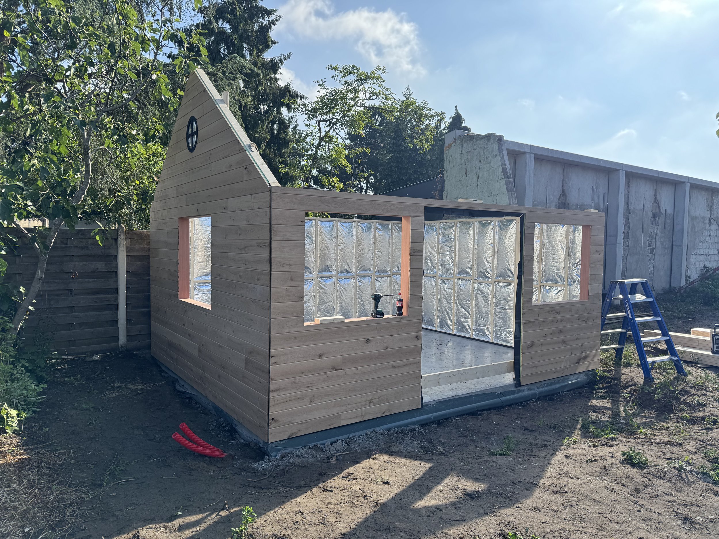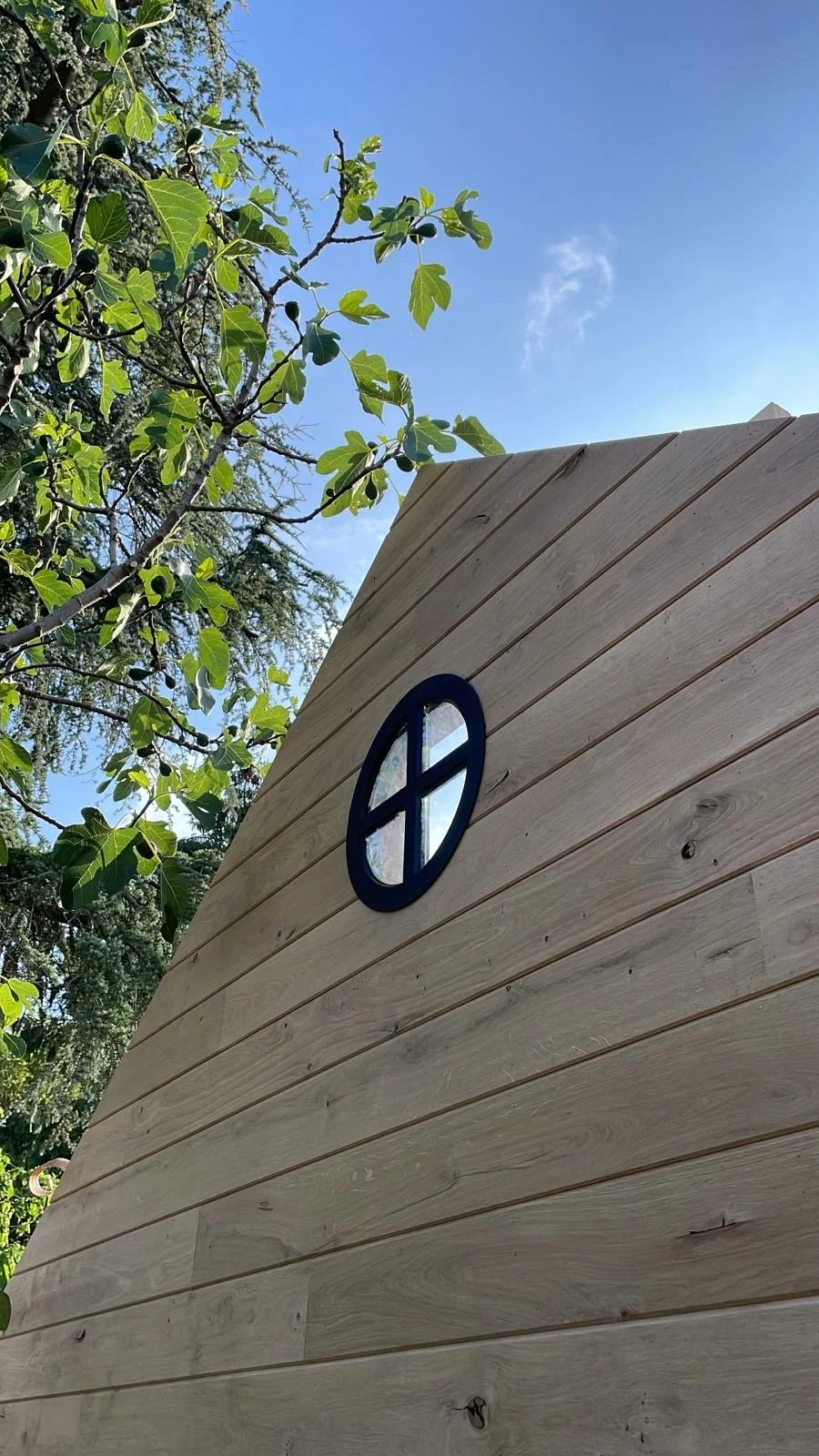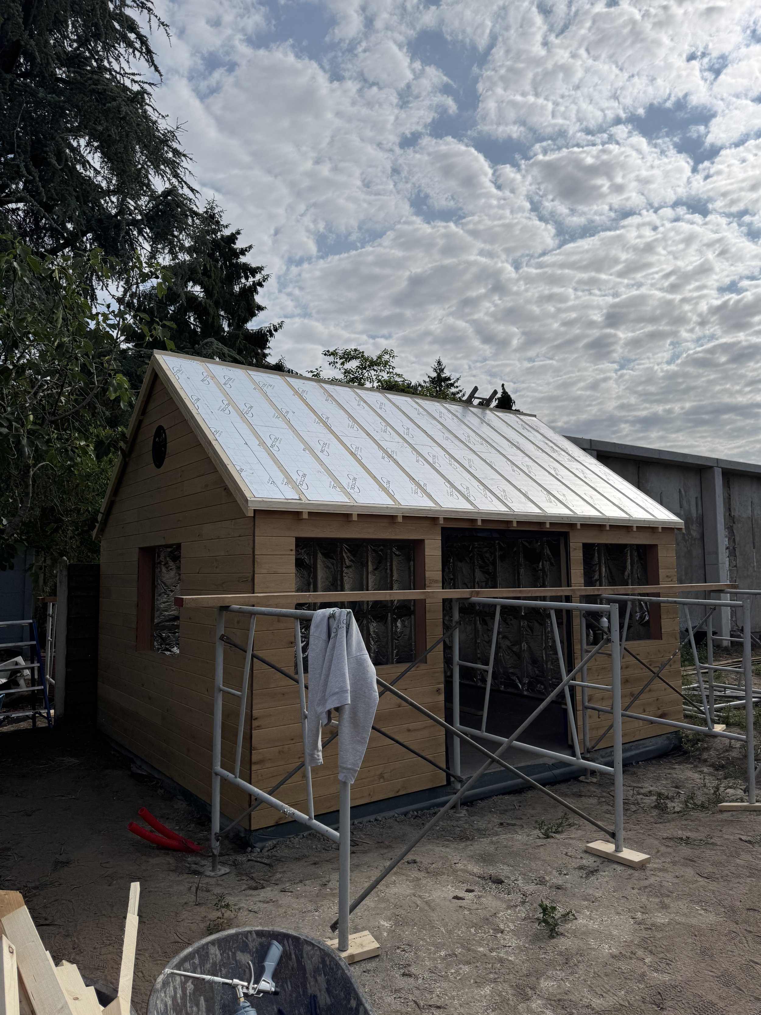 Het gebouw is uitgerust met twee grote ramen die overvloedig natuurlijk licht binnenlaten, en als charmant detail siert een rond raampje in de nok de zijgevel. Binnenin is het bijgebouw volledig voorzien van OSB-platen en volledig geïsoleerd, wat zorgt voor comfort en een aangename binnensfeer doorheen alle seizoenen.
