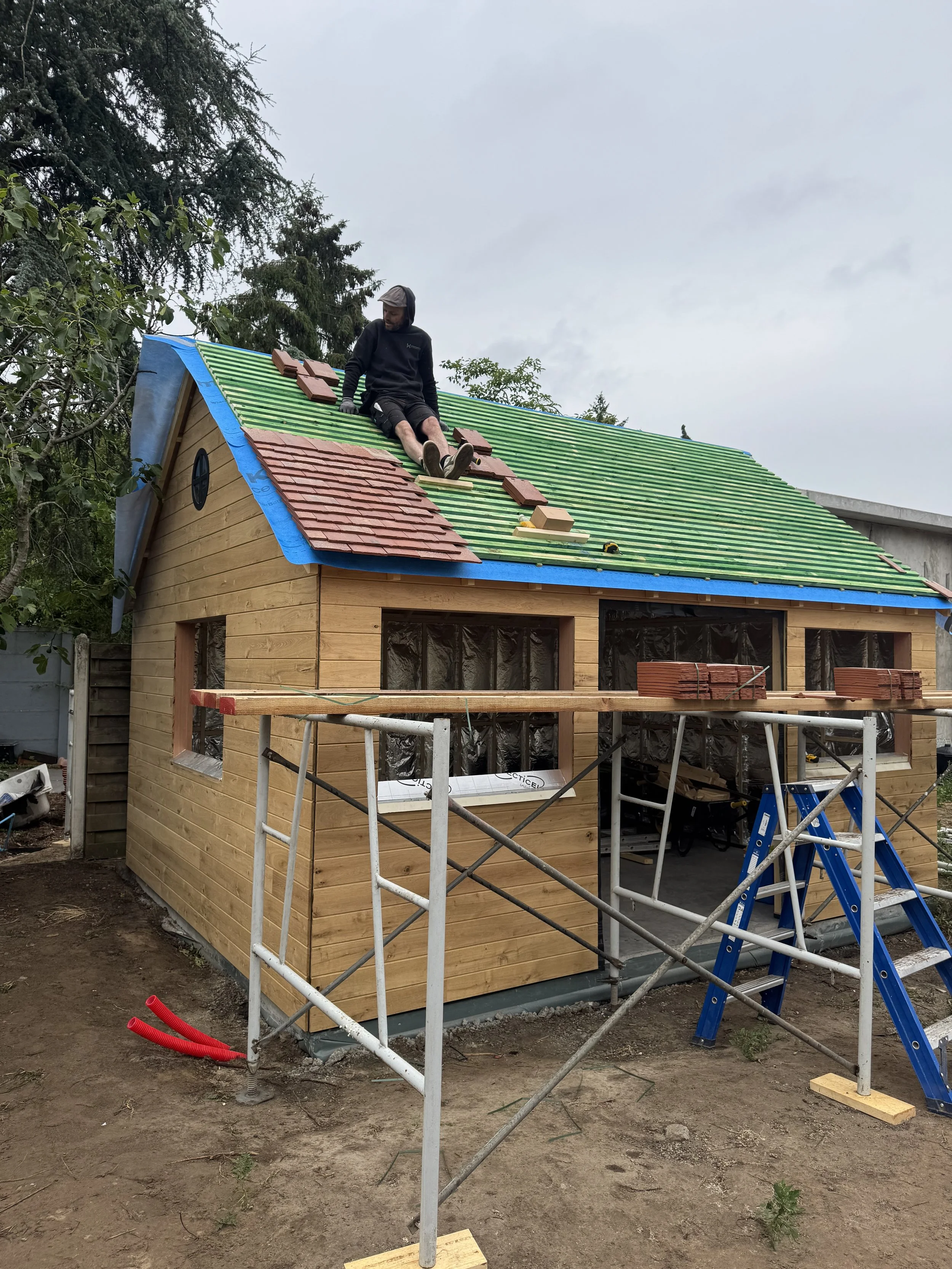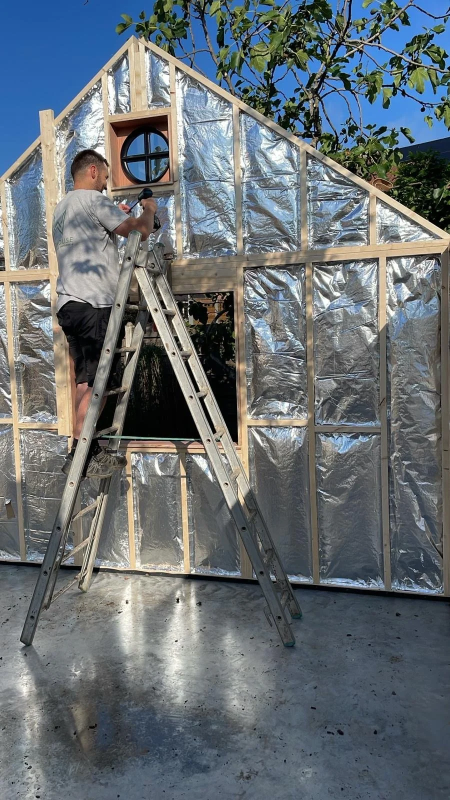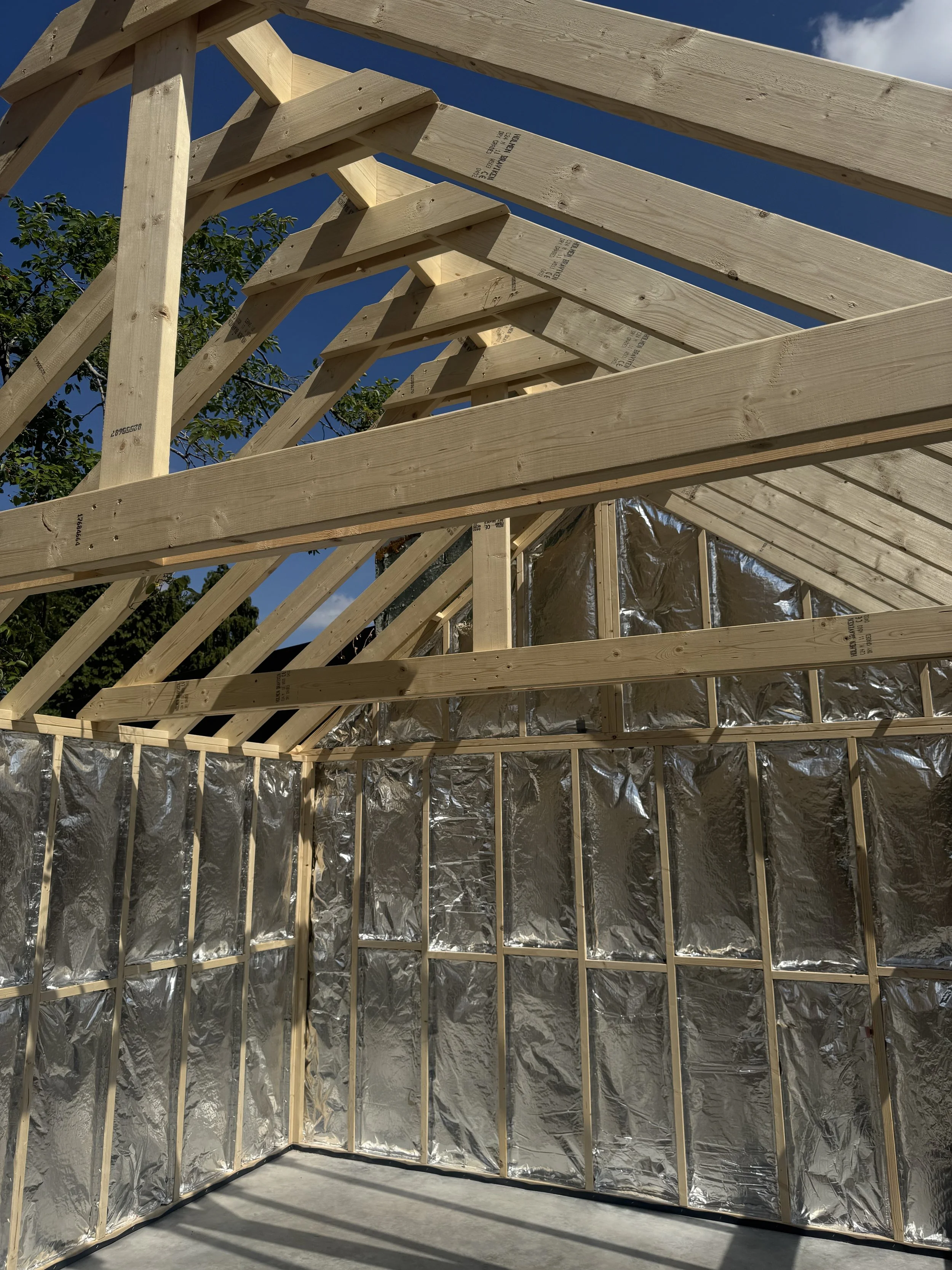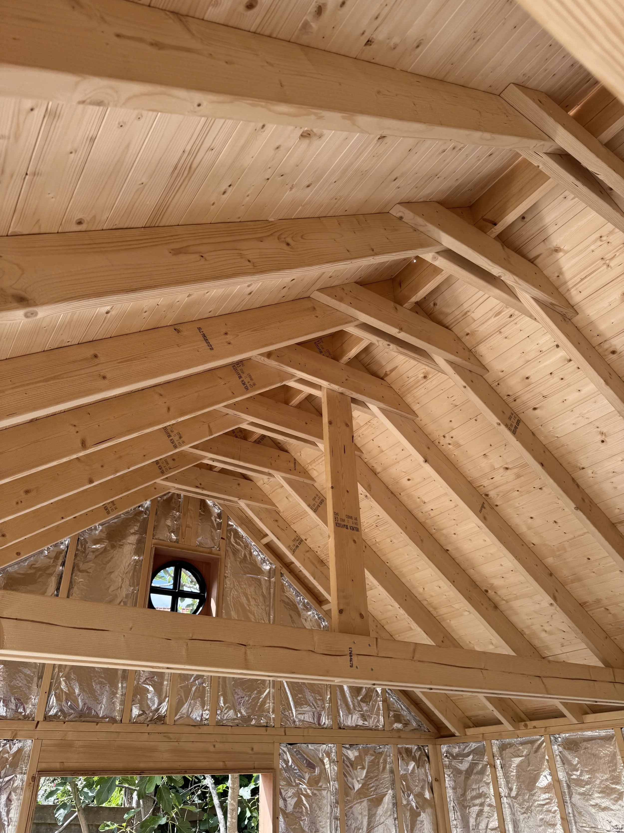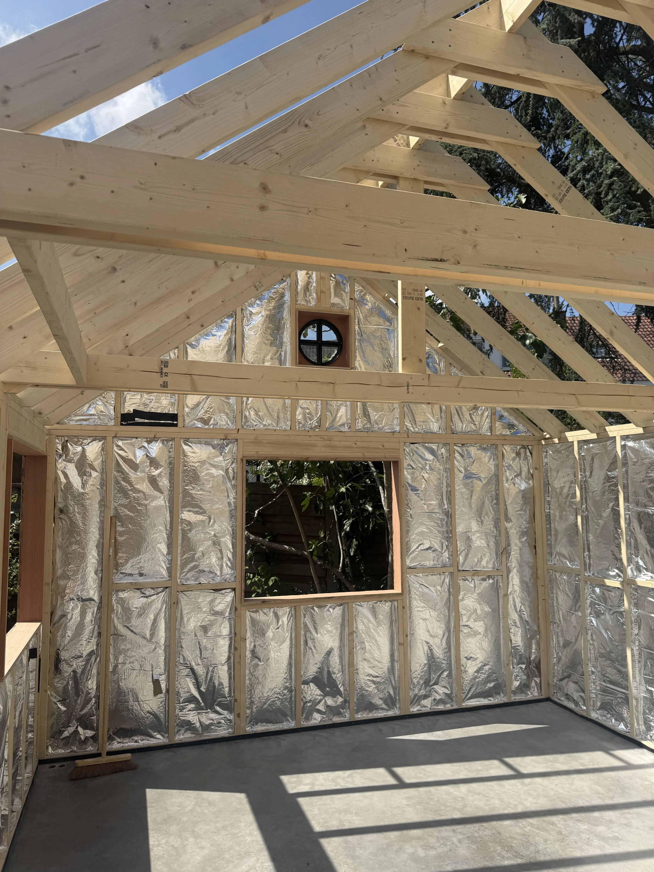 Het gebouw is uitgerust met twee grote ramen die overvloedig natuurlijk licht binnenlaten, en als charmant detail siert een rond raampje in de nok de zijgevel. Binnenin is het bijgebouw volledig voorzien van OSB-platen en volledig geïsoleerd, wat zorgt voor comfort en een aangename binnensfeer doorheen alle seizoenen.