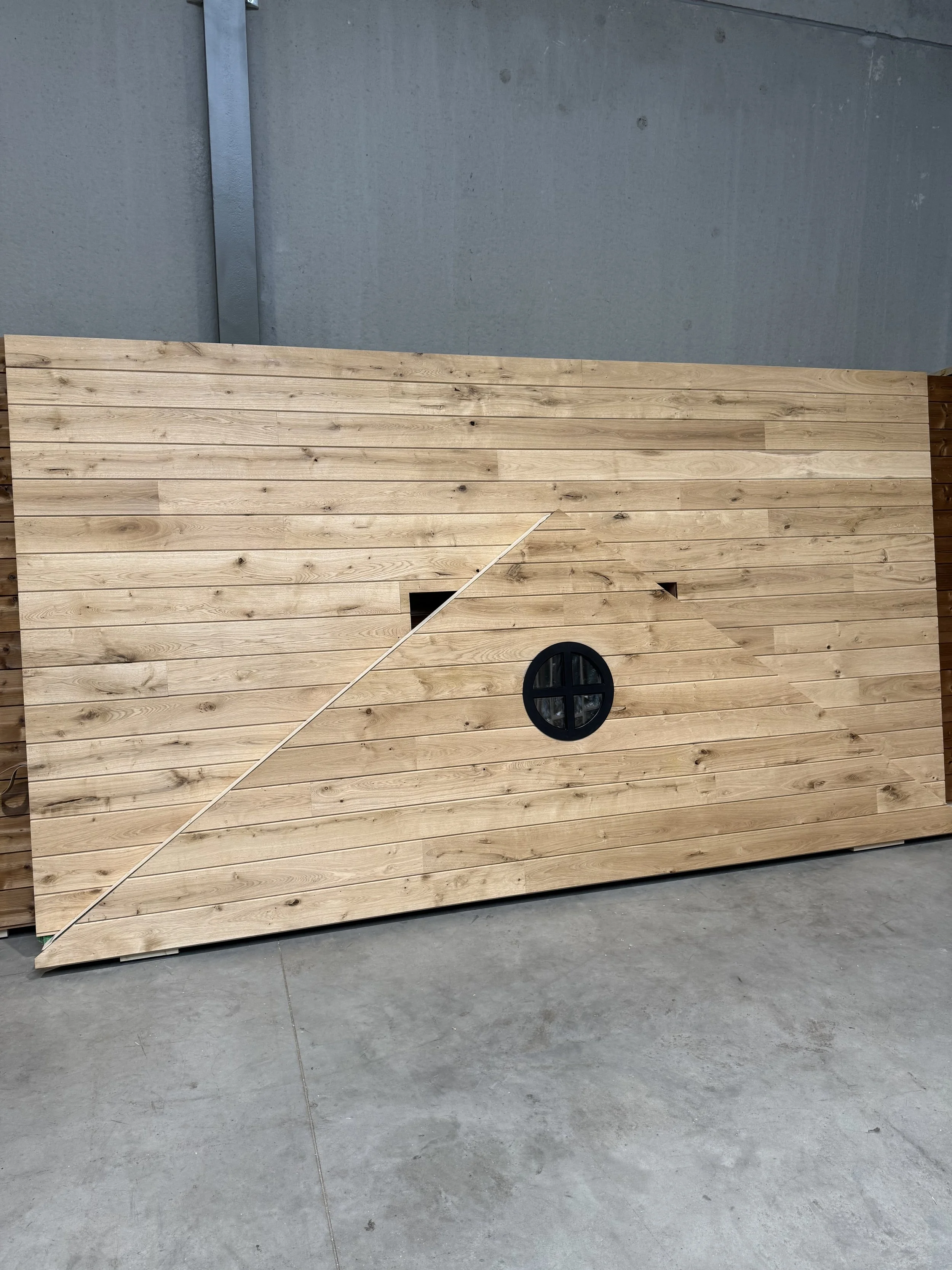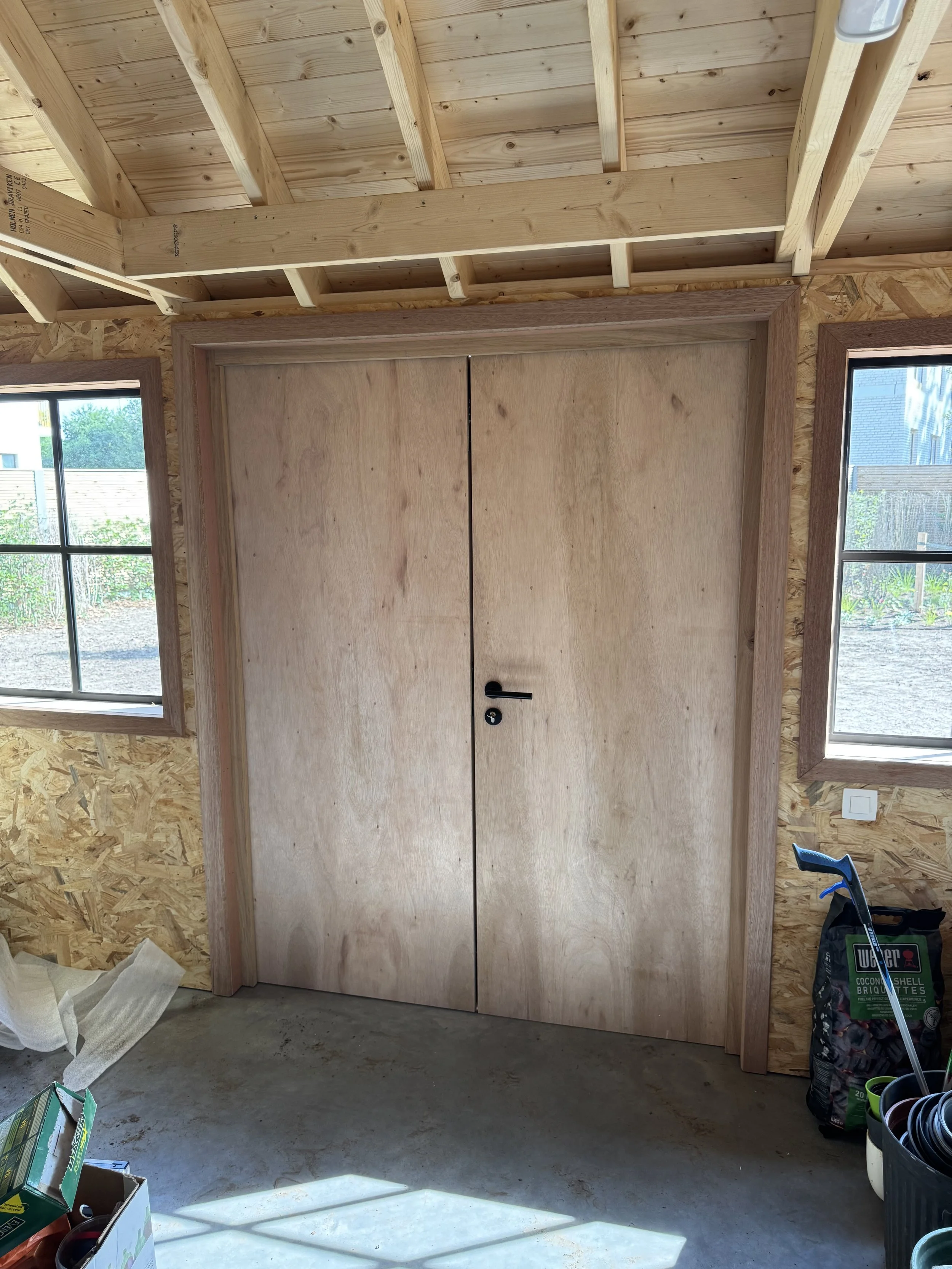 In Mariakerke realiseerden we dit prachtige eiken bijgebouw, volledig geplaatst op een gepolierde betonvloer voor een strakke en duurzame basis. De buitenzijde is afgewerkt met horizontale eiken planchetten, terwijl de dubbele deur een stijlvol accent krijgt dankzij de verticale eiken afwerking en het landelijke deurbeslag.
