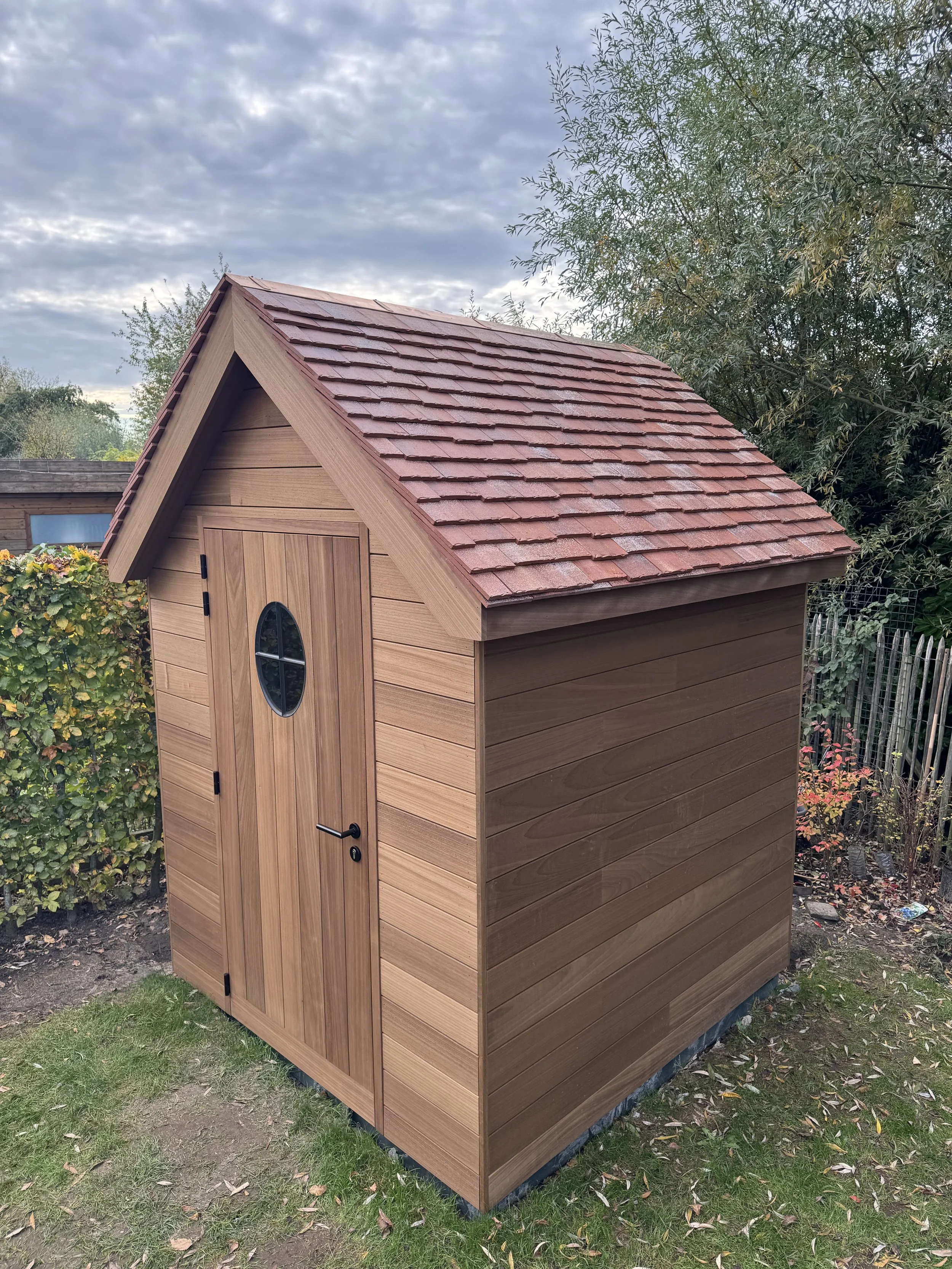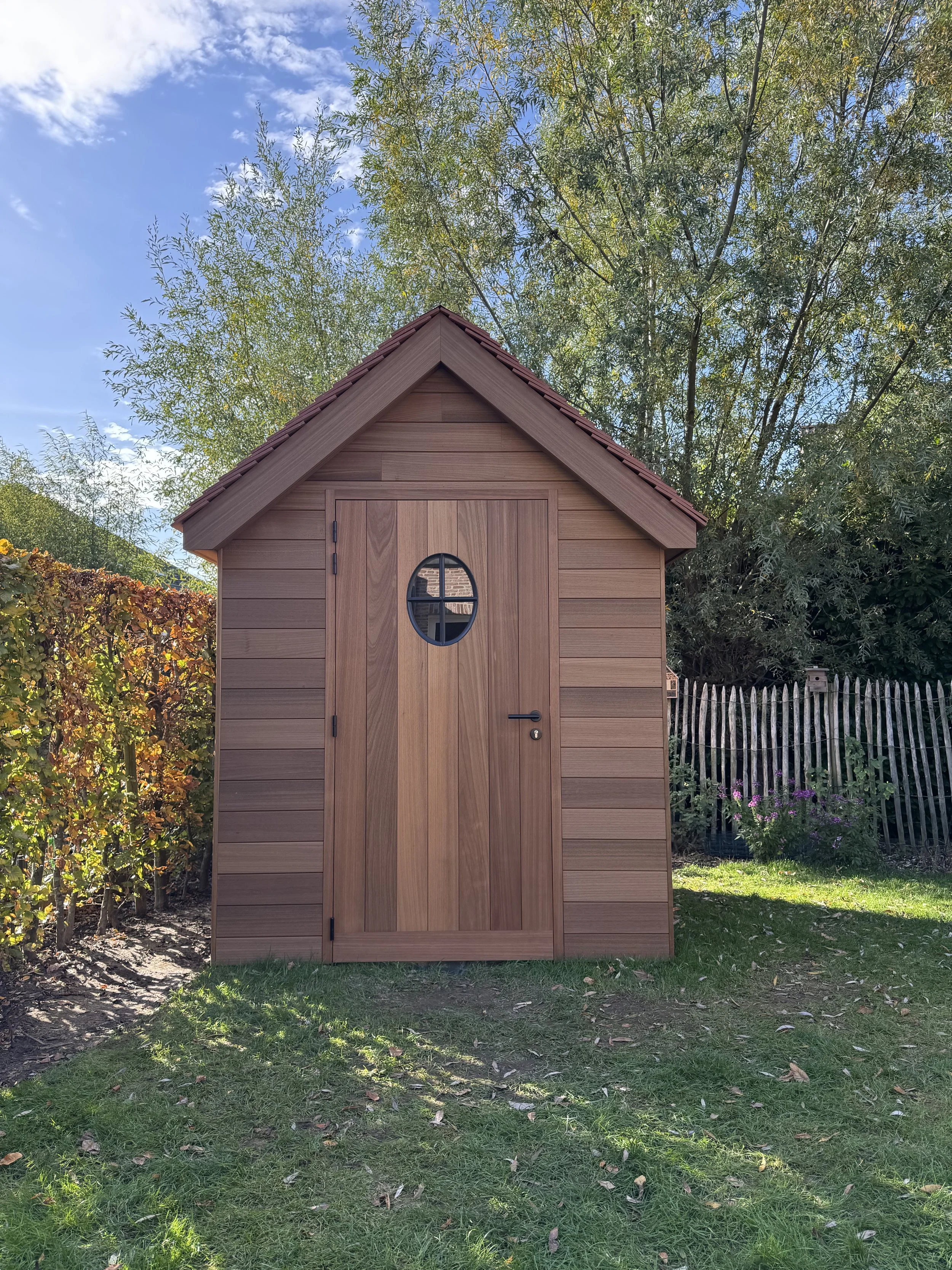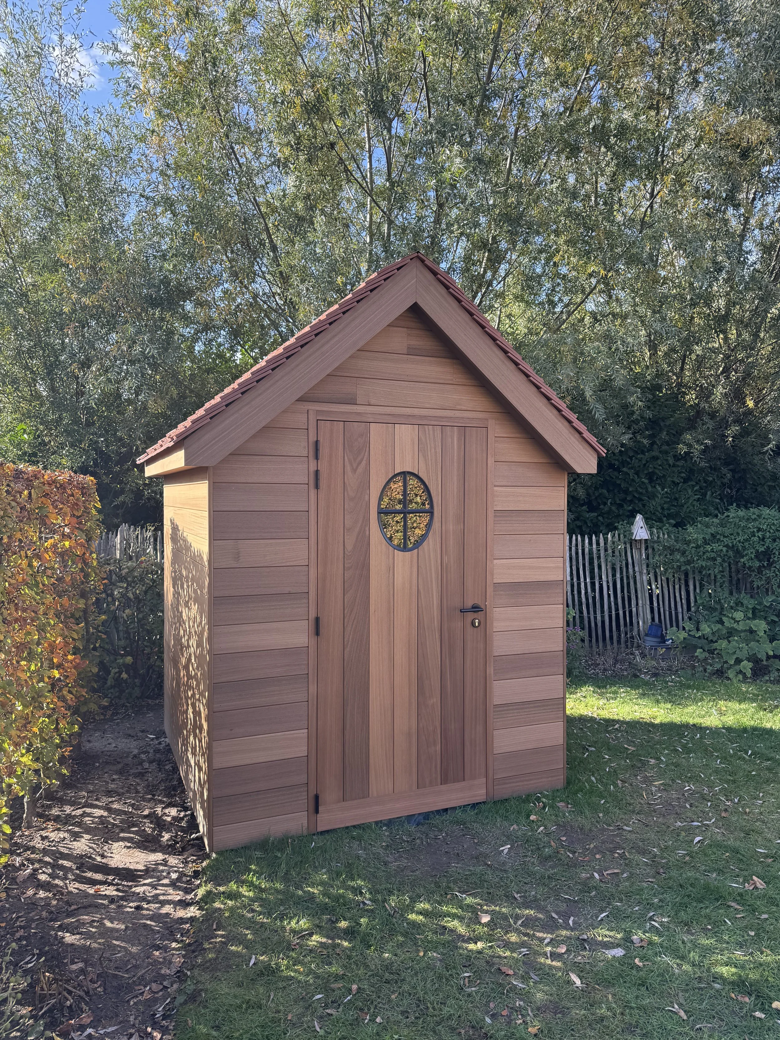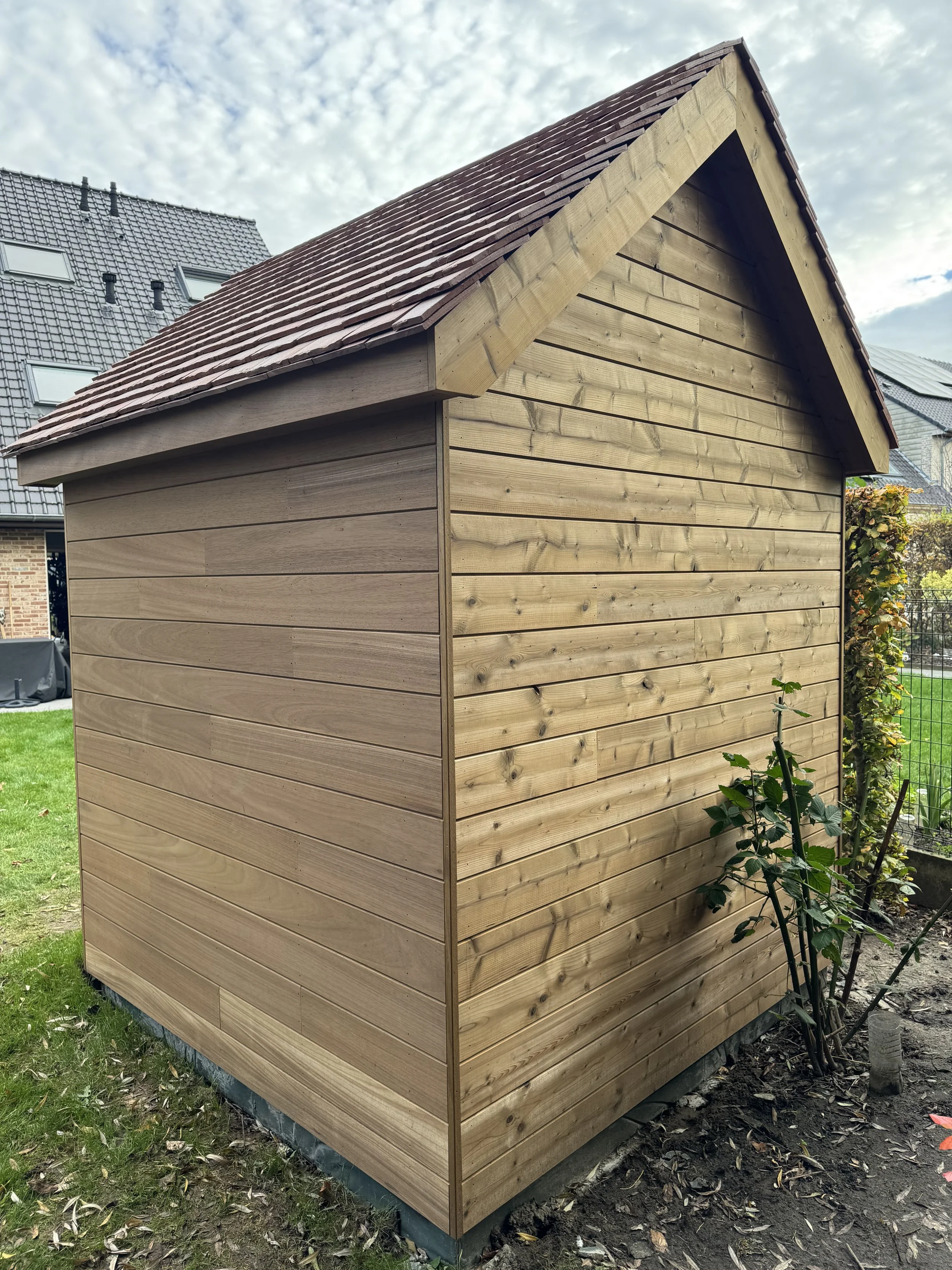 Voor onze klant in Wondelgem mochten we deze kleine landelijke tuinberging realiseren. Het charmante ontwerp is afgewerkt met horizontale ayous planchetten, terwijl de deur met verticale planchetten zorgt voor een subtiel maar stijlvol contrast. De tegelpannetjes op het dak versterken het landelijke karakter, en het ossenoog in de gevel voegt dat extra vleugje authenticiteit en charme toe.