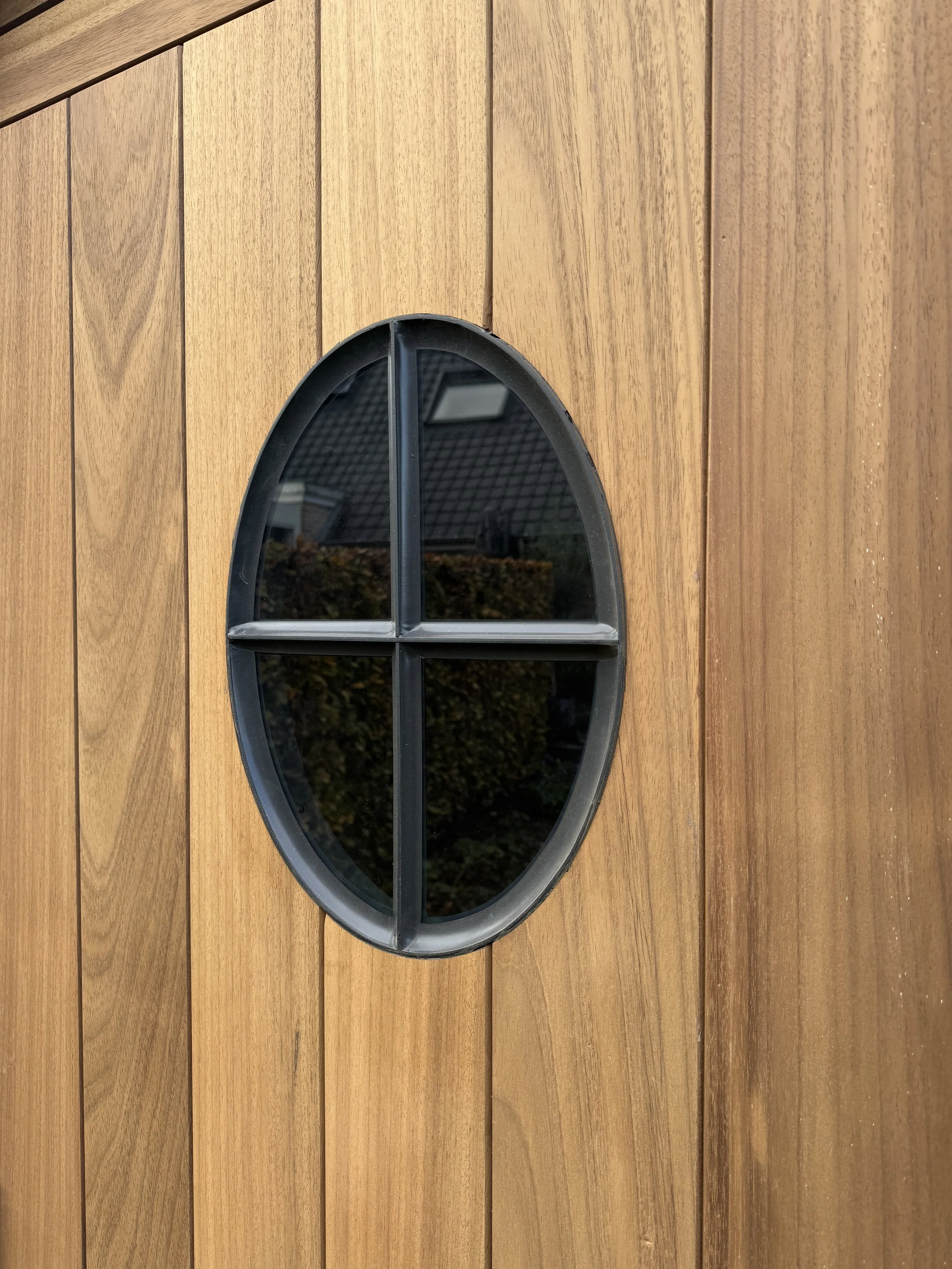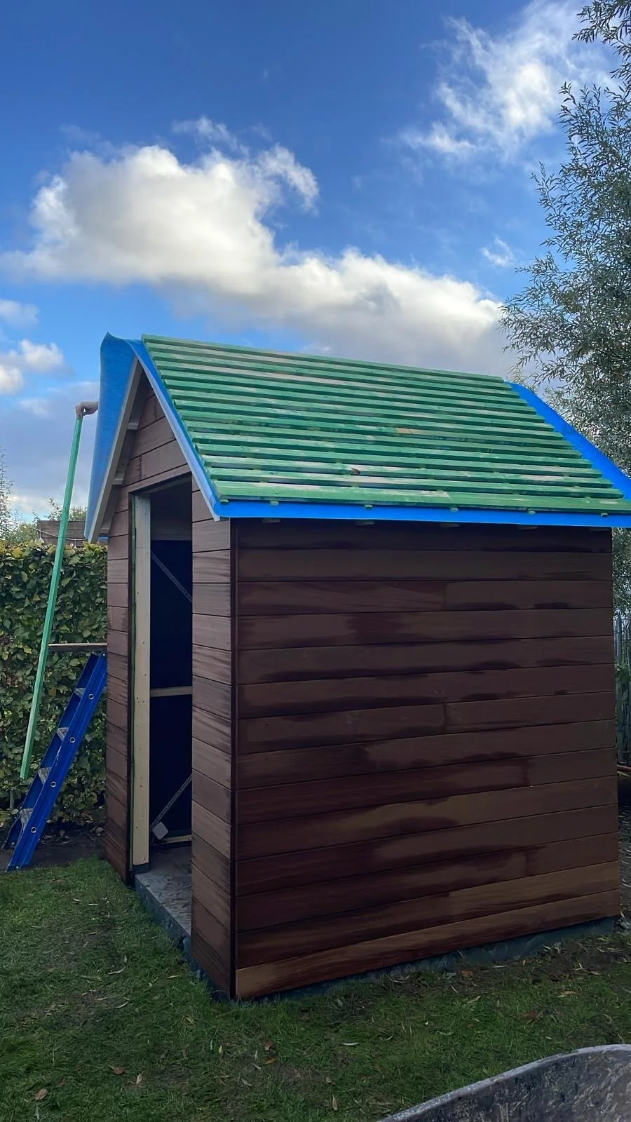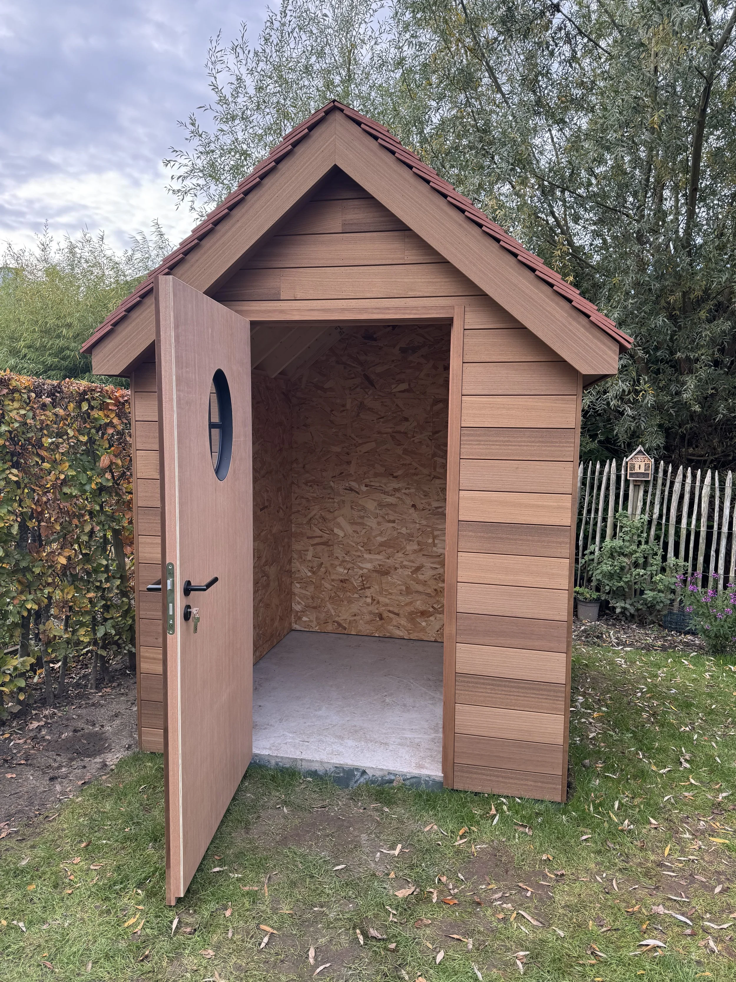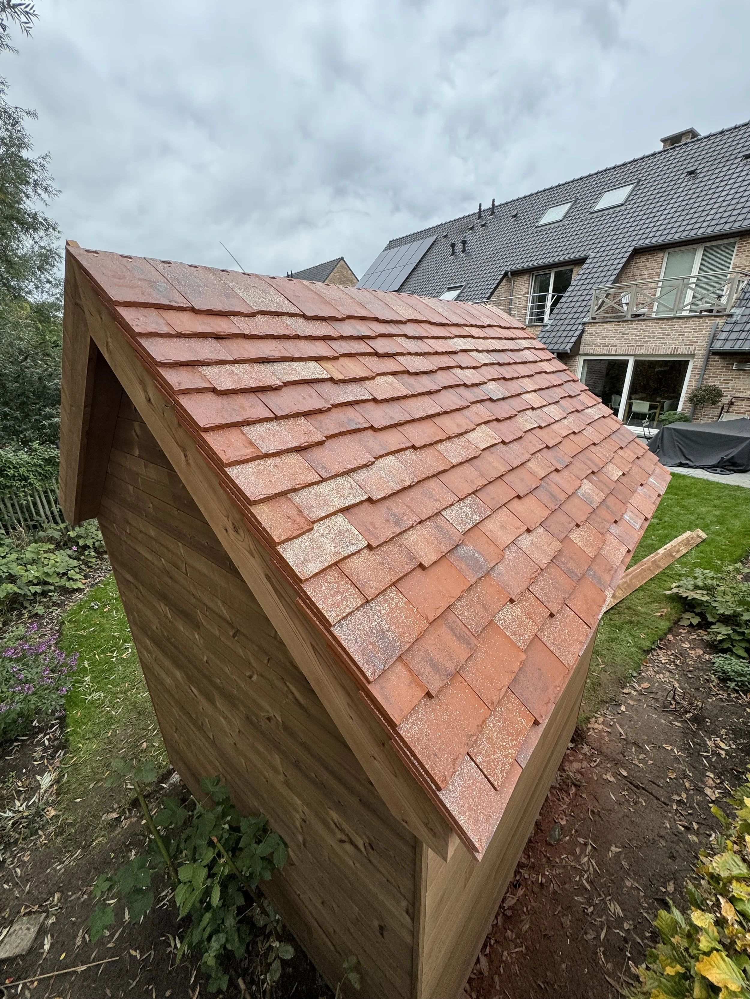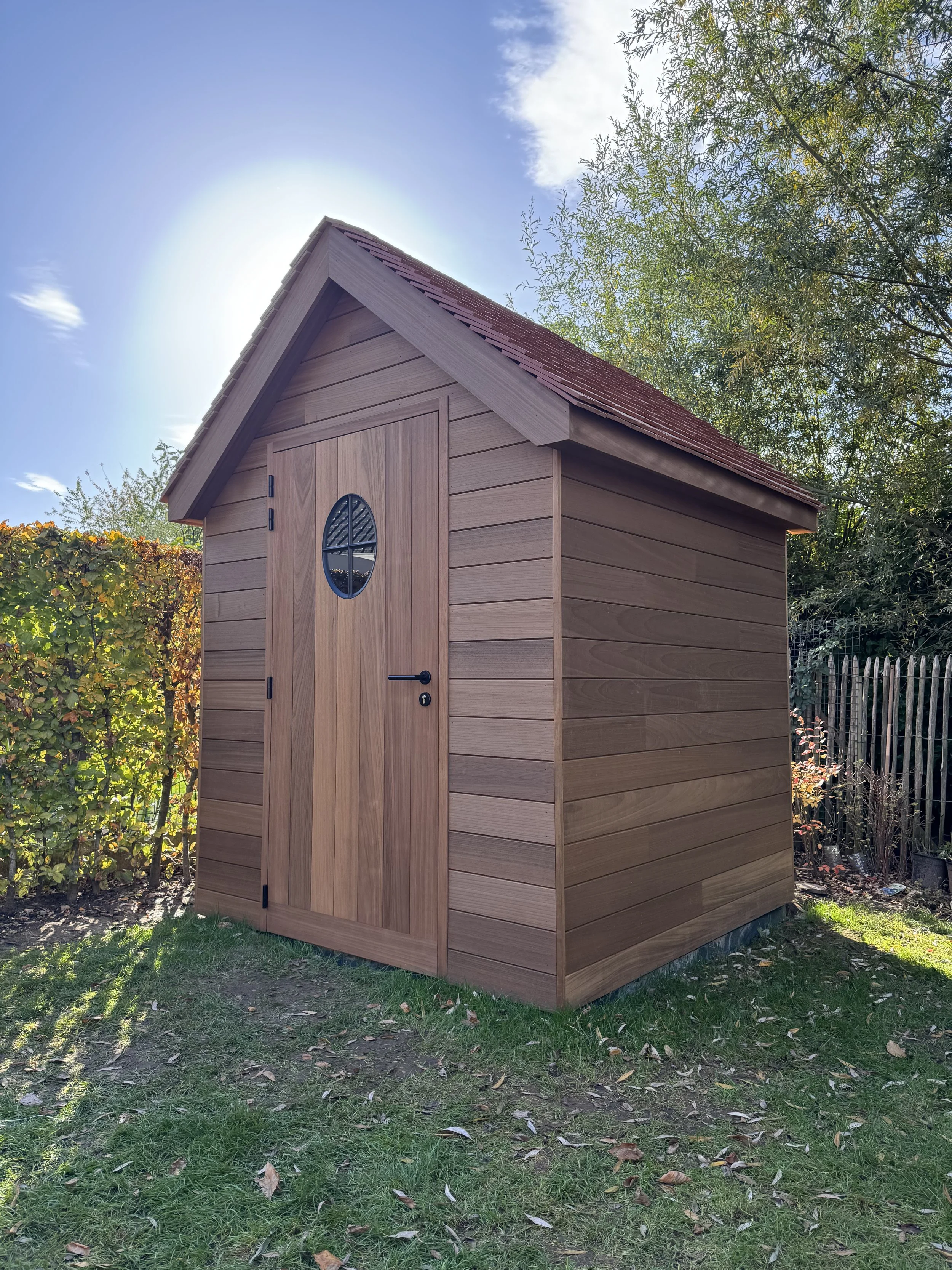 Voor onze klant in Wondelgem mochten we deze kleine landelijke tuinberging realiseren. Het charmante ontwerp is afgewerkt met horizontale ayous planchetten, terwijl de deur met verticale planchetten zorgt voor een subtiel maar stijlvol contrast. De tegelpannetjes op het dak versterken het landelijke karakter, en het ossenoog in de gevel voegt dat extra vleugje authenticiteit en charme toe.