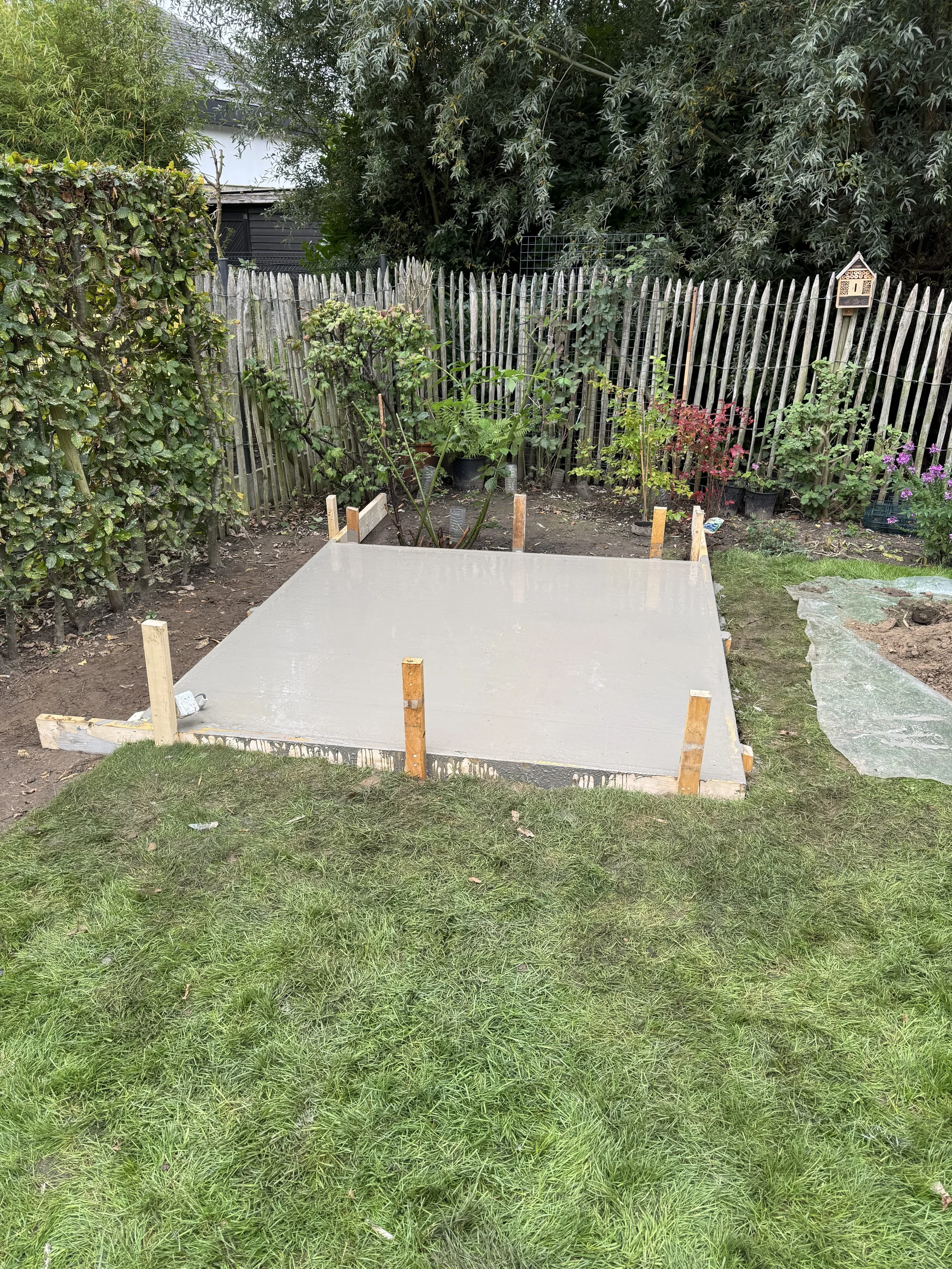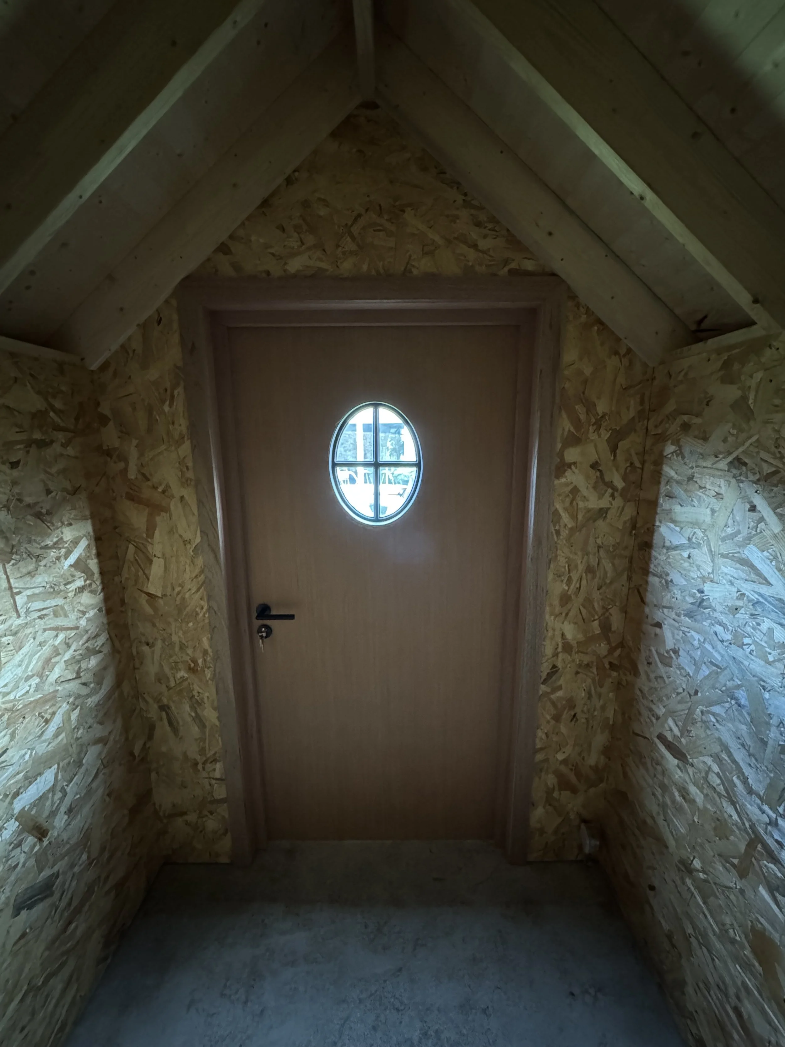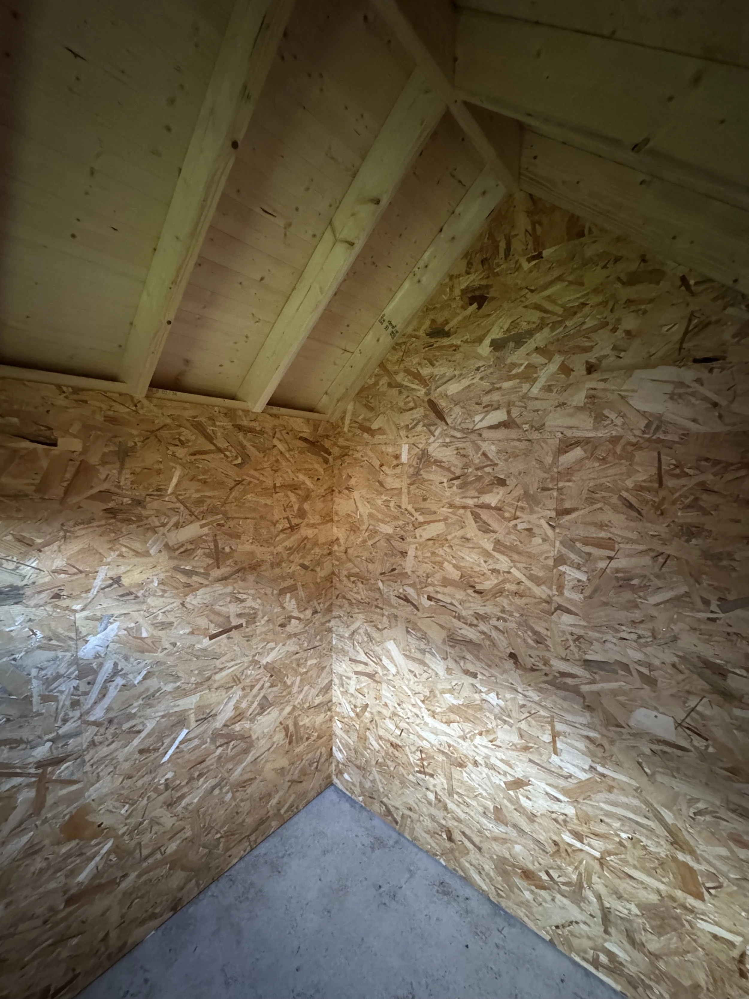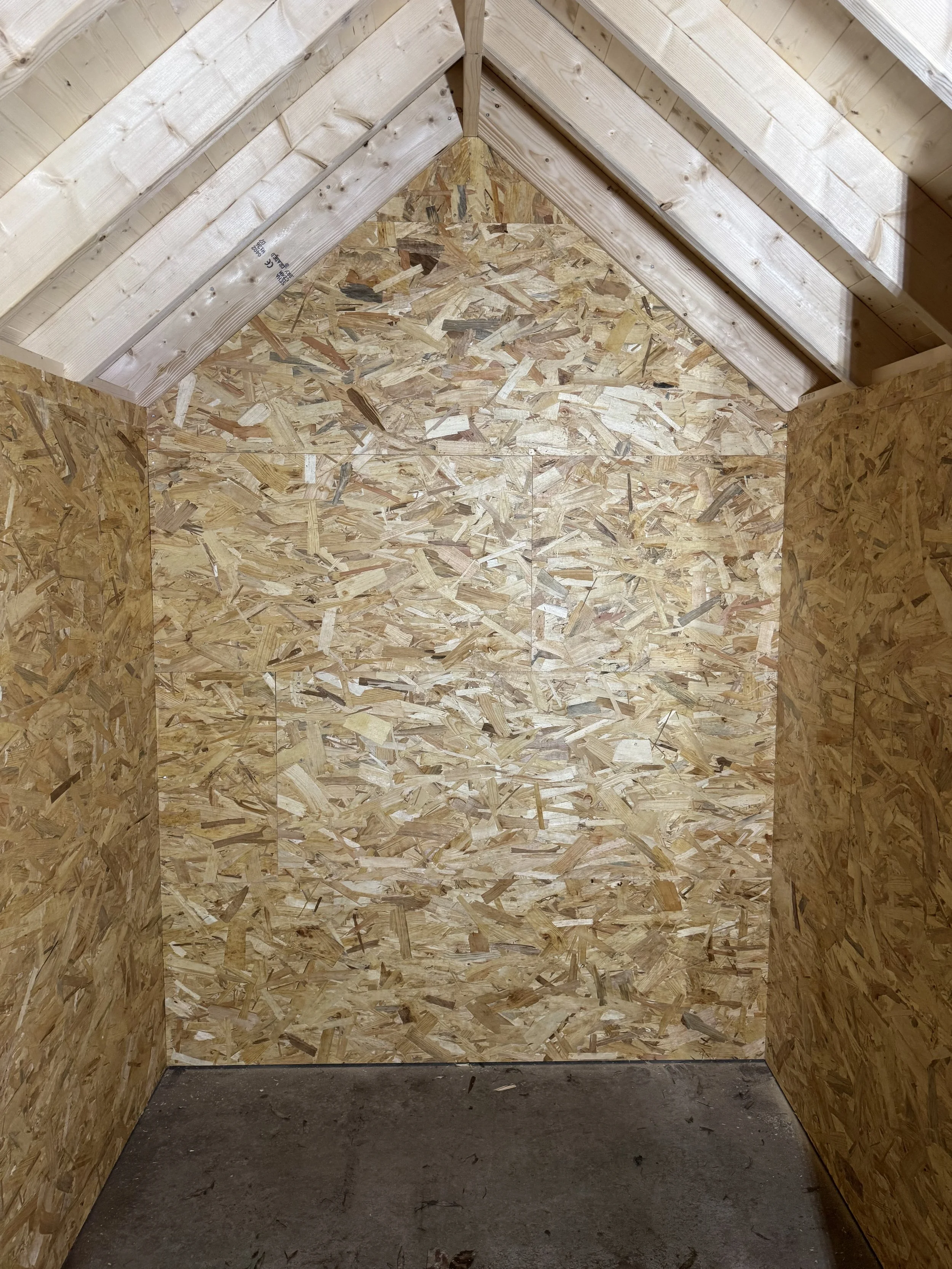 De binnenzijde is volledig afgewerkt met OSB-platen, wat zorgt voor een stevige, onderhoudsvriendelijke en praktische opbergruimte. Een harmonieuze combinatie van ambachtelijke uitstraling en functioneel gebruiksgemak, perfect passend bij de landelijke stijl van de tuin.