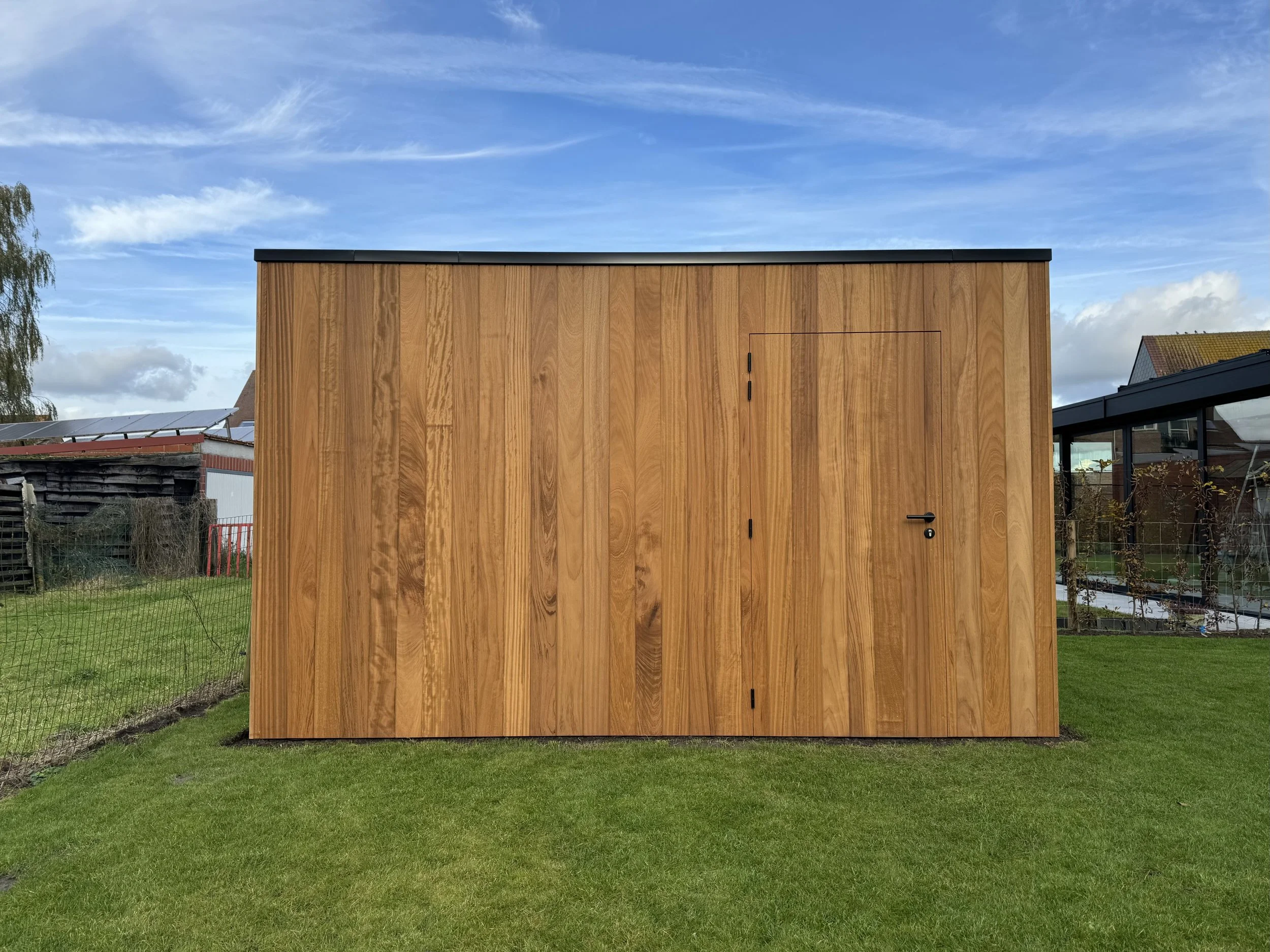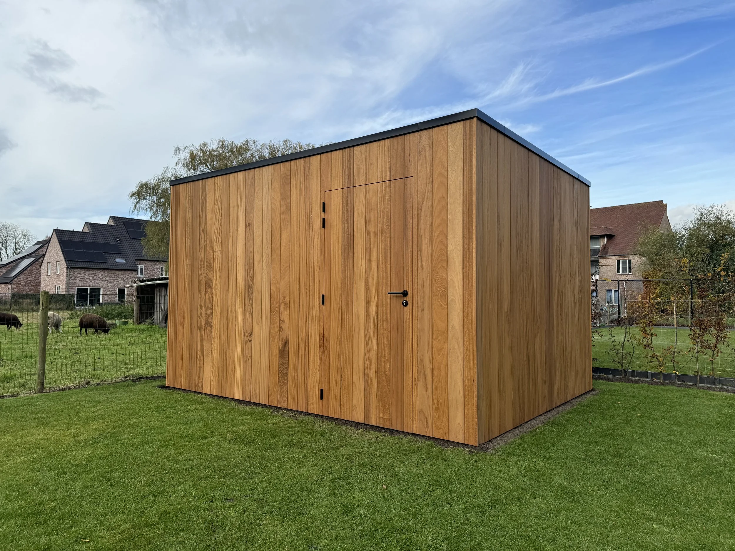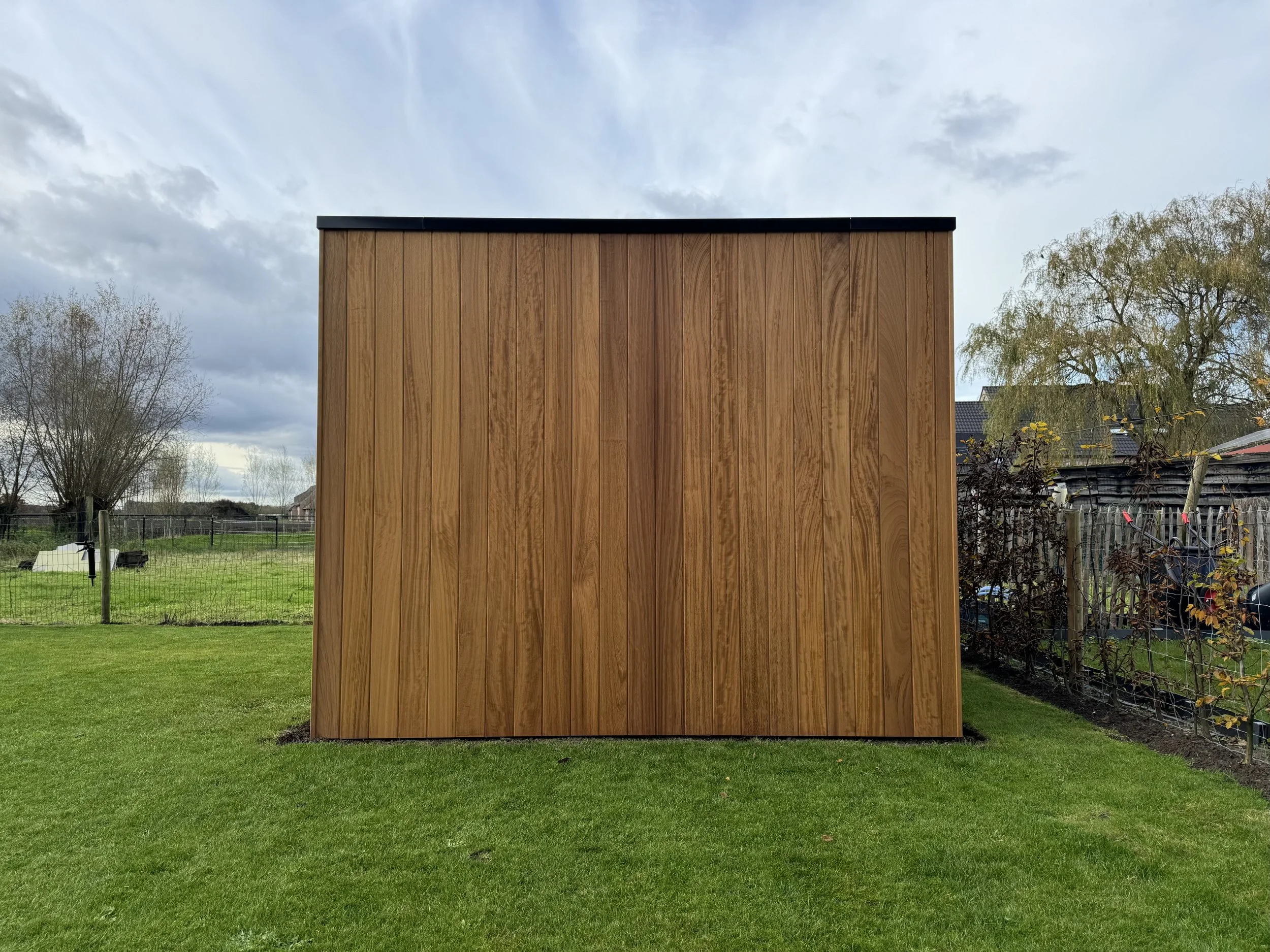 Deze strakke tuinberging is stijlvol afgewerkt met Iroko planchetten op de zichtbare zijden, wat zorgt voor een warme en natuurlijke uitstraling. De niet-zichtbare zijden zijn voorzien van duurzame Thermowood planchetten. De zwarte dakranden en het moderne deurbeslag voegen een elegant contrast toe, waardoor het geheel een minimalistische en tijdloze uitstraling krijgt, perfect passend in iedere tuinomgeving.