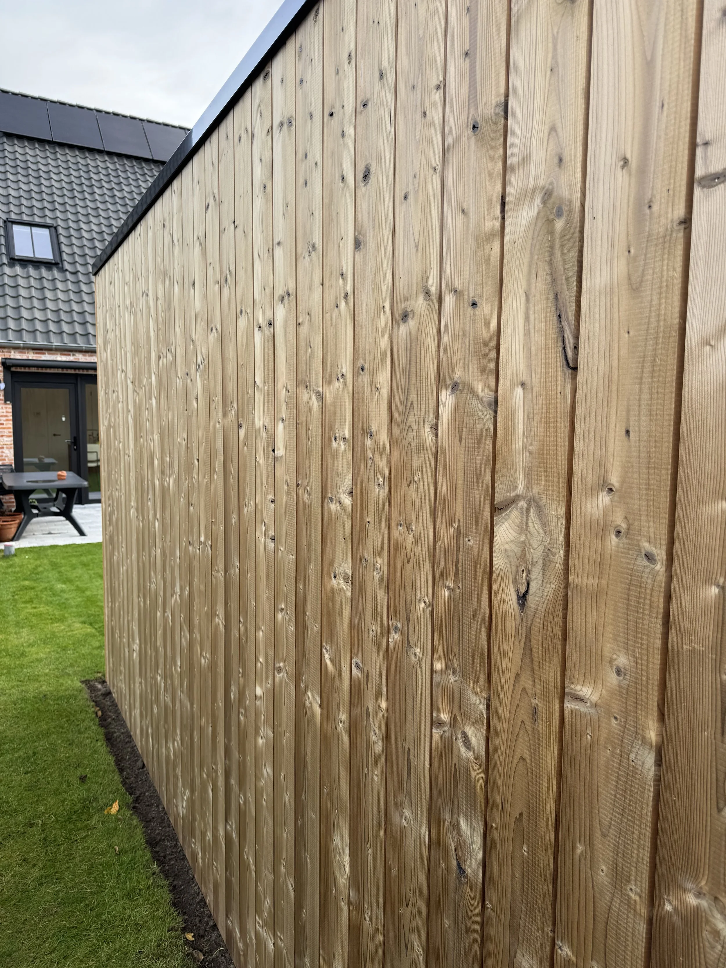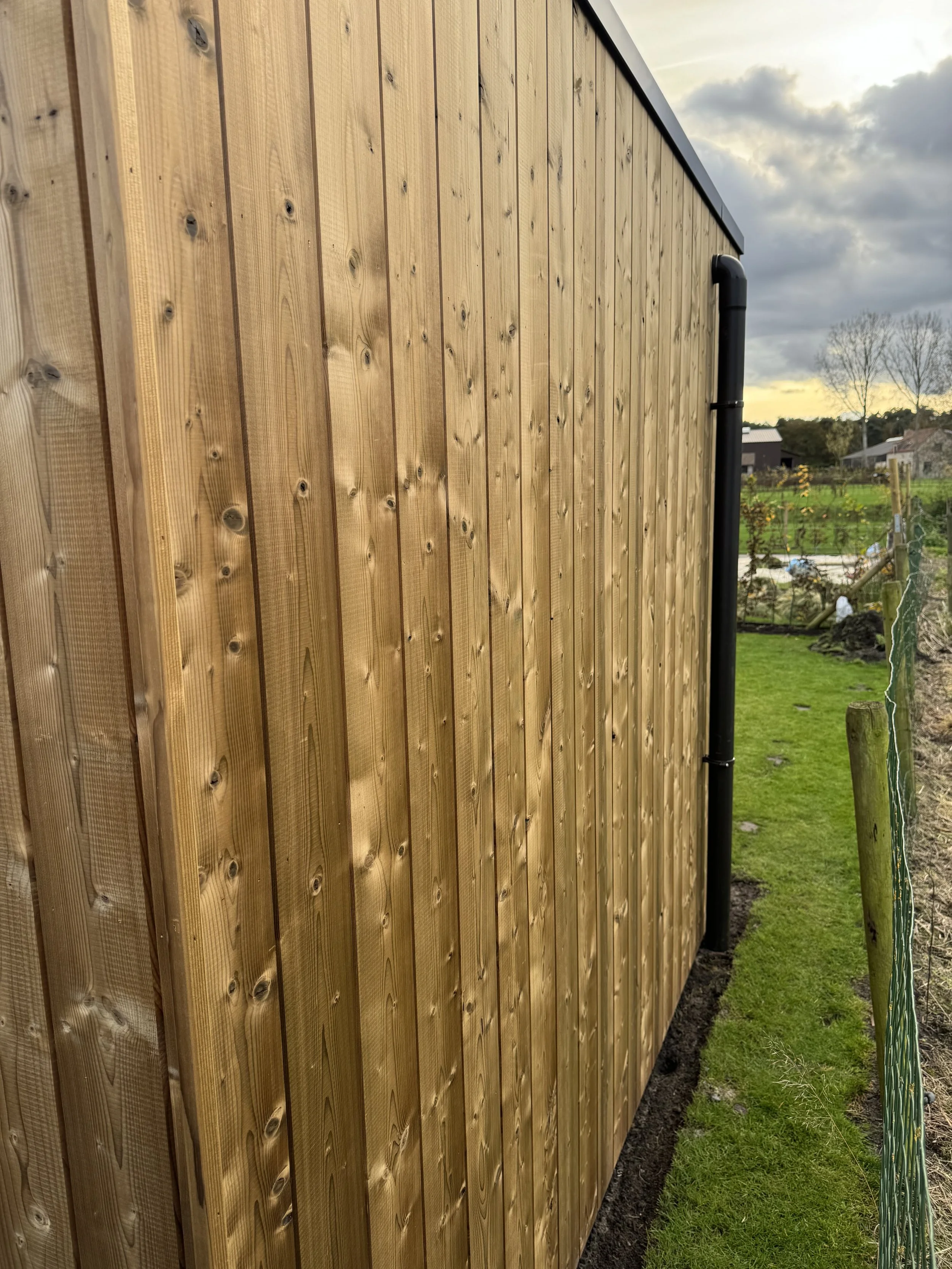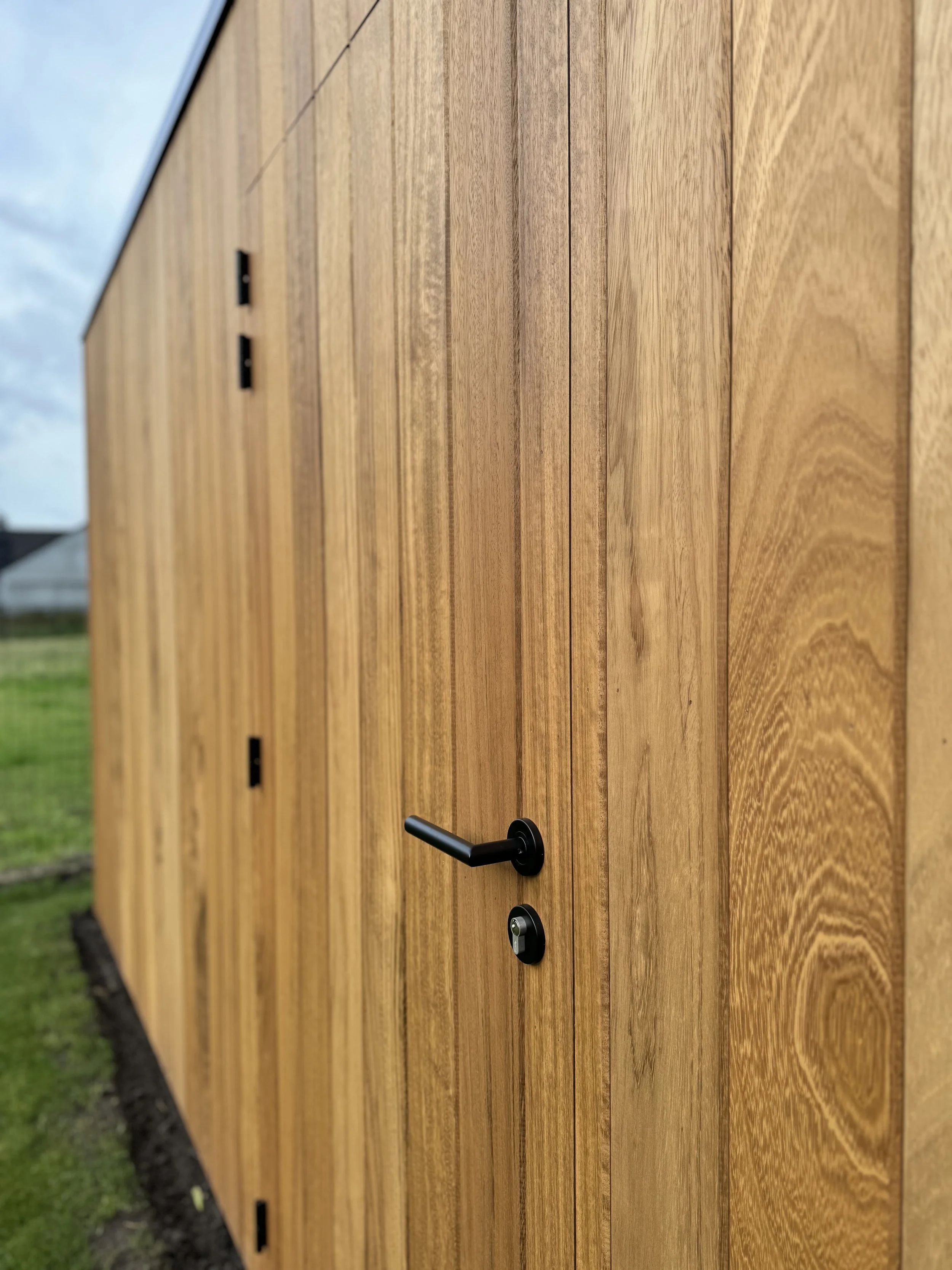 Deze strakke tuinberging is stijlvol afgewerkt met Iroko planchetten op de zichtbare zijden, wat zorgt voor een warme en natuurlijke uitstraling. De niet-zichtbare zijden zijn voorzien van duurzame Thermowood planchetten. De zwarte dakranden en het moderne deurbeslag voegen een elegant contrast toe, waardoor het geheel een minimalistische en tijdloze uitstraling krijgt, perfect passend in iedere tuinomgeving.