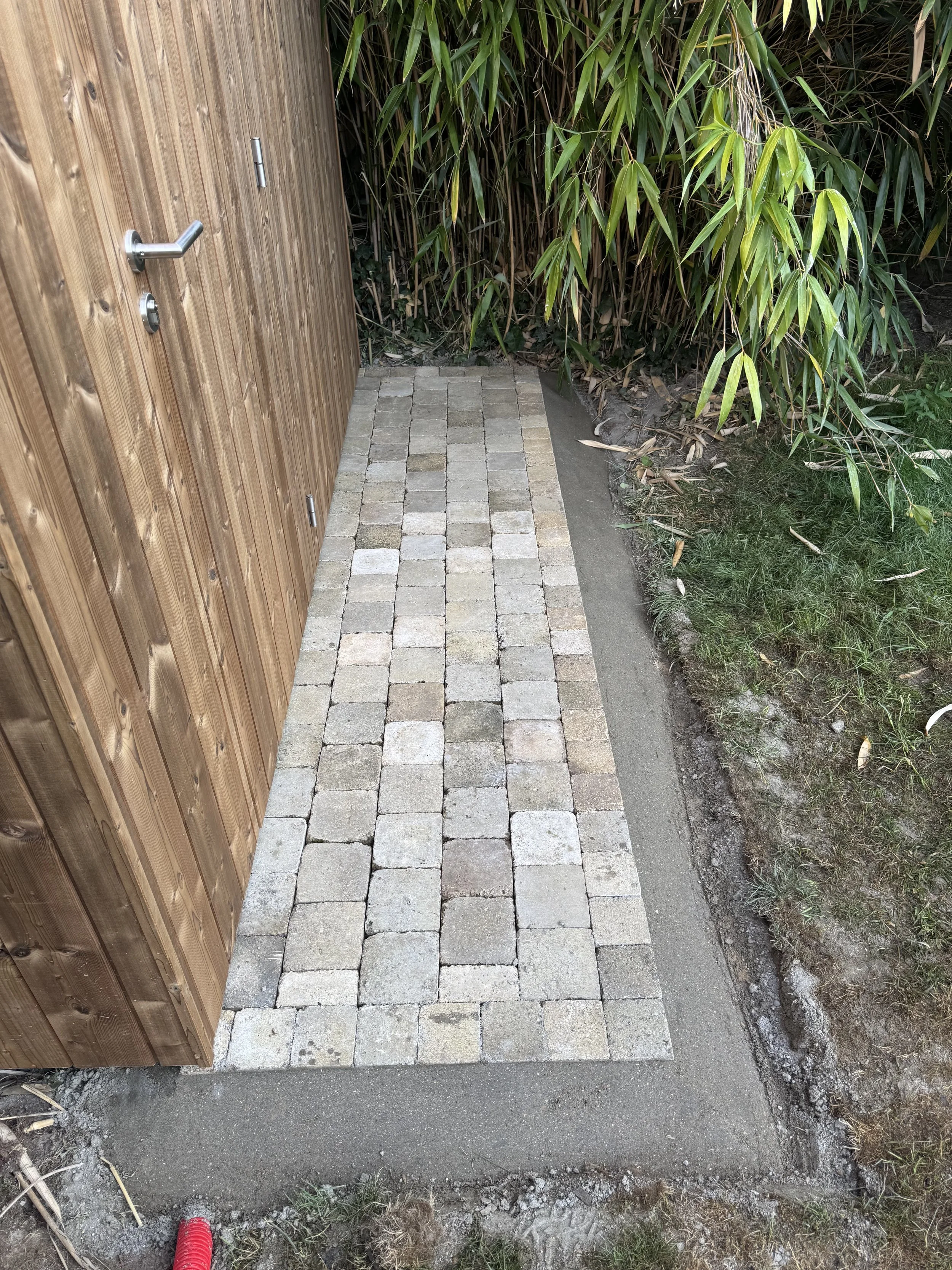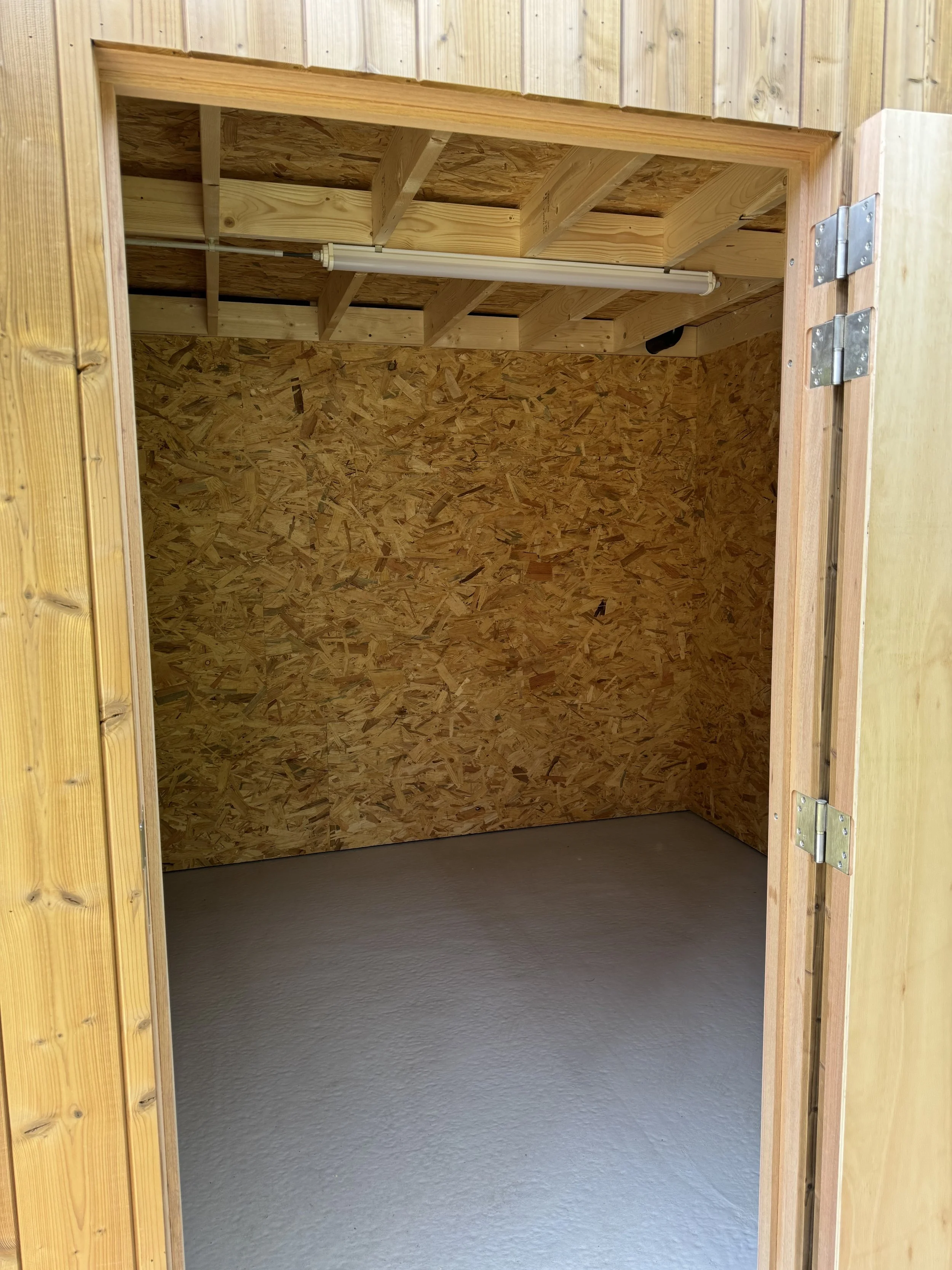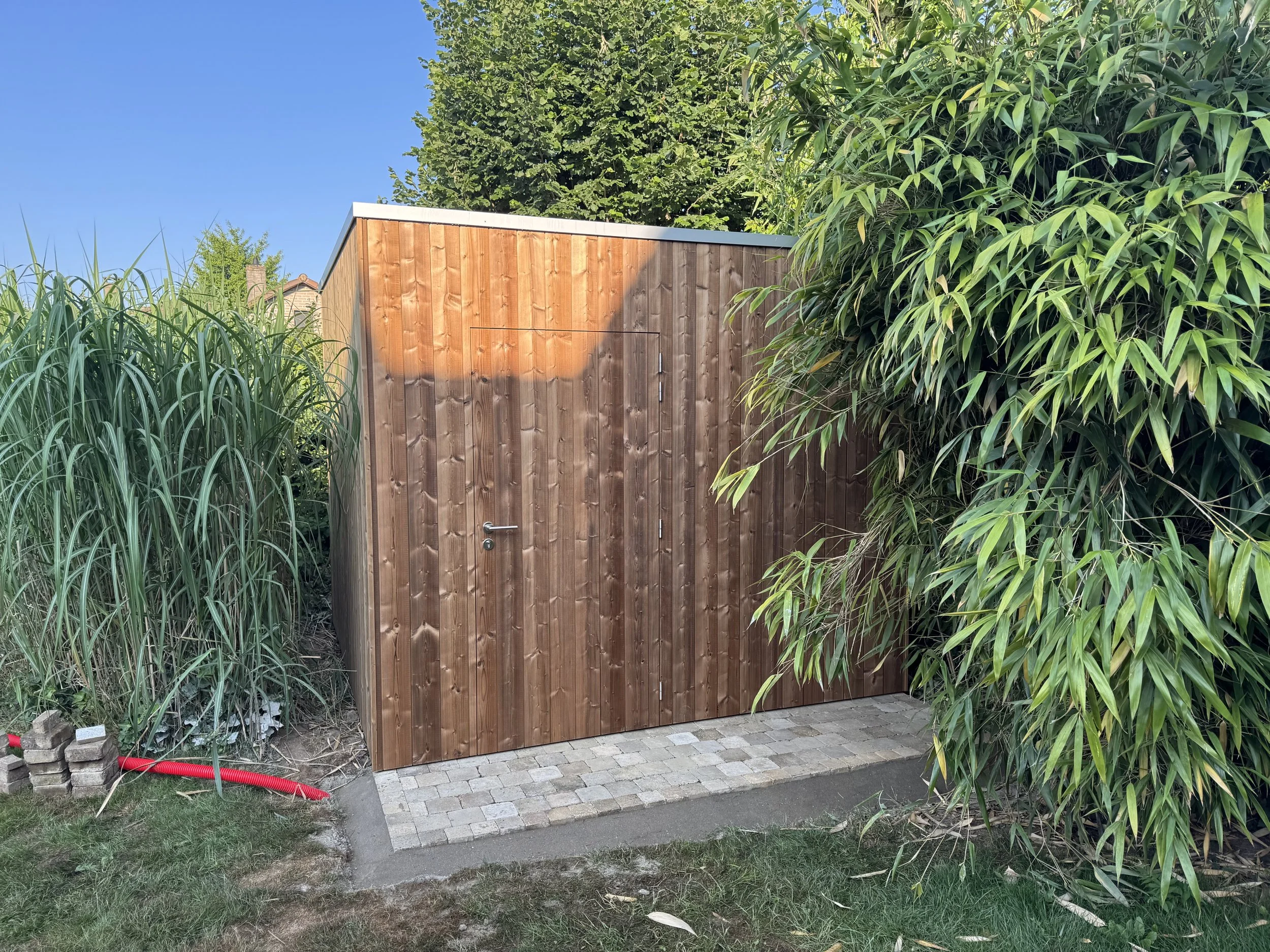 De tuinberging Caja bewijst dat eenvoud ook verfijning kan uitstralen. Deze compacte, strak vormgegeven berging is afgewerkt met verticale thermowood planchetten die zorgen voor een moderne, warme uitstraling. Binnenin zijn de wanden bekleed met OSB, ideaal om rekken of gereedschap aan te bevestigen. Onze standaard elektrische installatie is inbegrepen, zodat alles meteen gebruiksklaar is. Voor een nette en toegankelijke toegang plaatsten we een strook betonklinkers, praktisch én esthetisch.